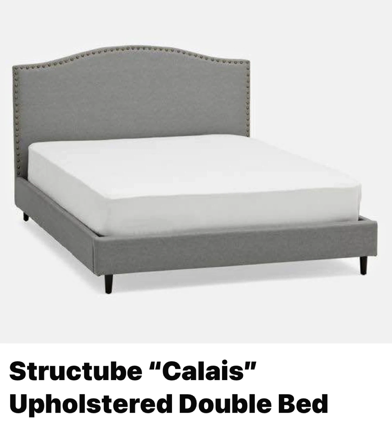 Structube "Calais" upholstered double bed frame. It's upholstered in grey fabric and features a nailhead trim headboard. Legs are black.