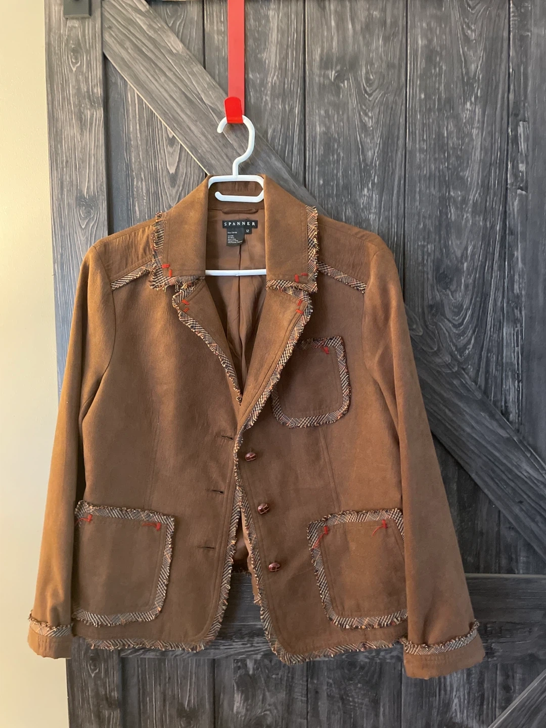 This Spanner blazer is a rich brown colour. It features decorative trim with frayed edges and red stitching. It's a size 12, perfect for adding a stylish layer to any outfit.