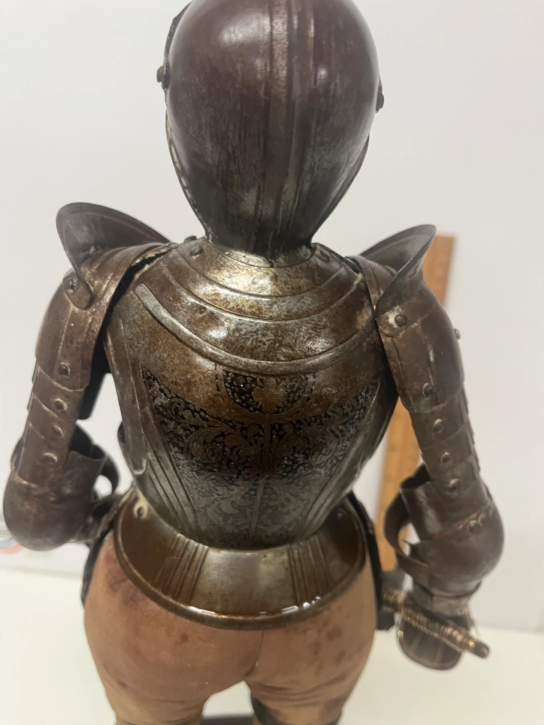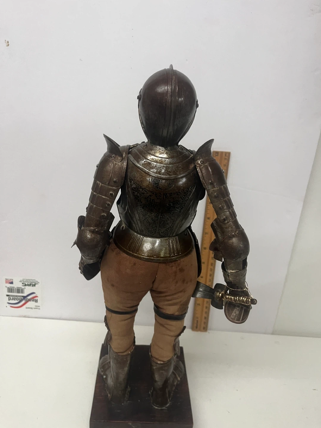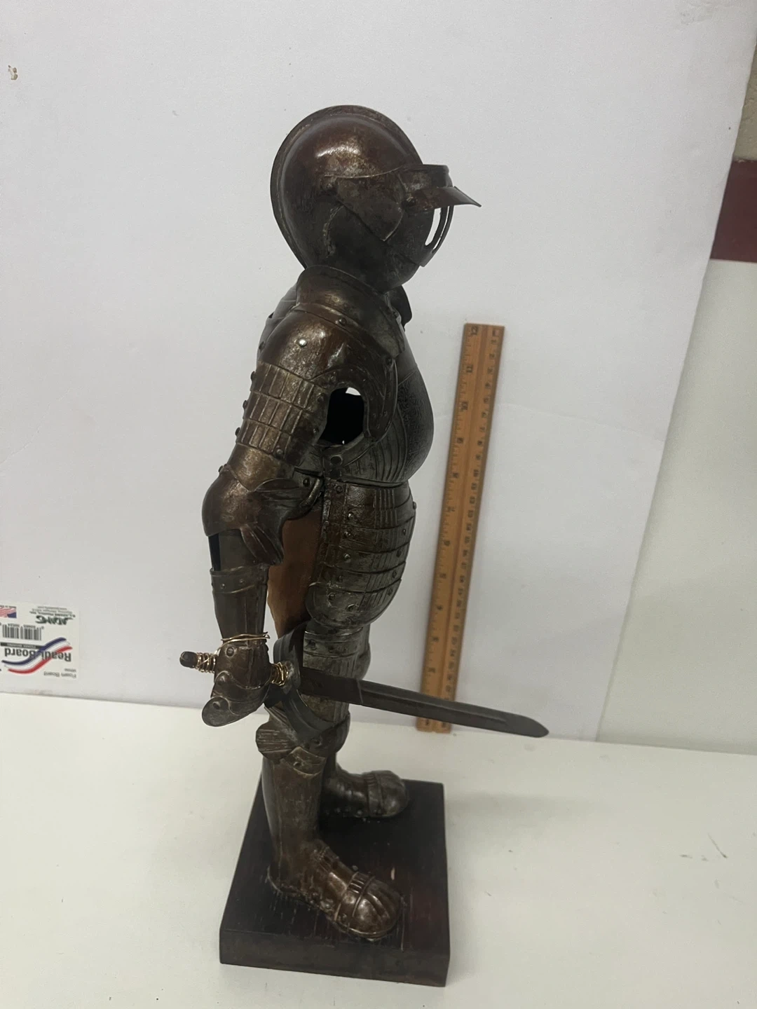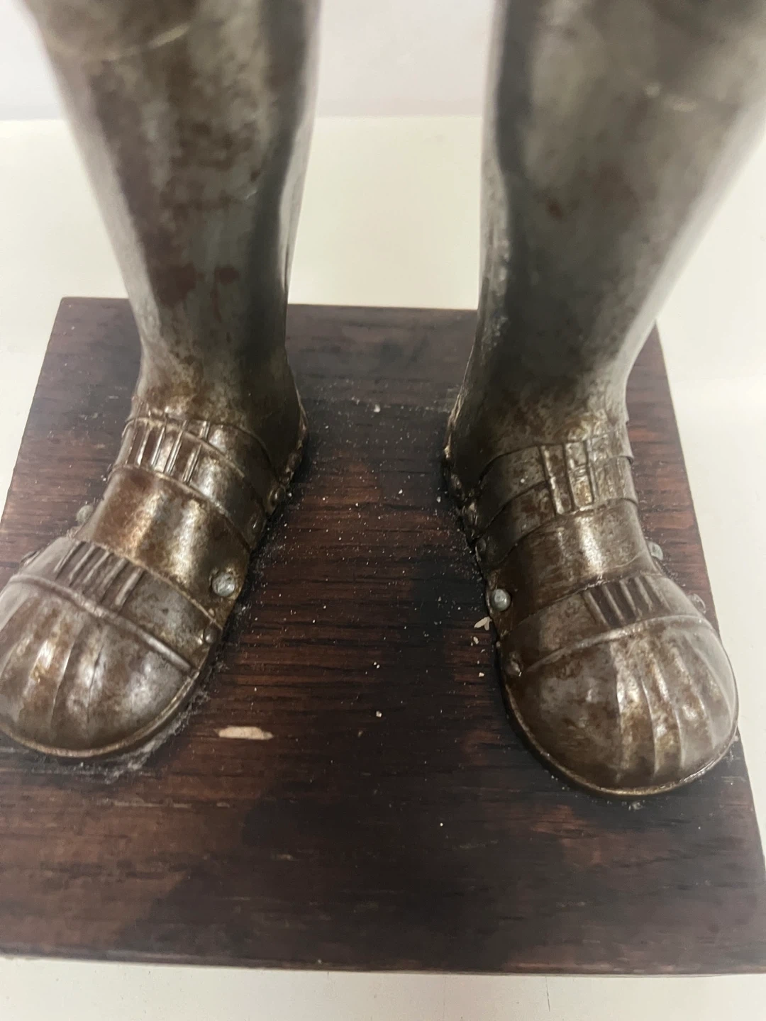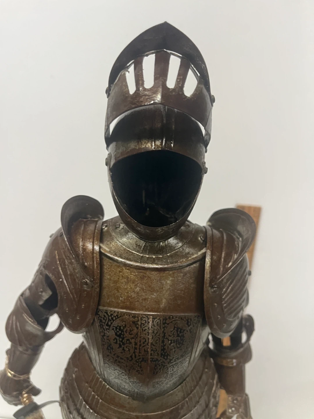 This is a 19th century decorative figurine of a knight in full armor. It features intricate detailing on the metal plating and includes a sword. The figurine stands on a wooden base.