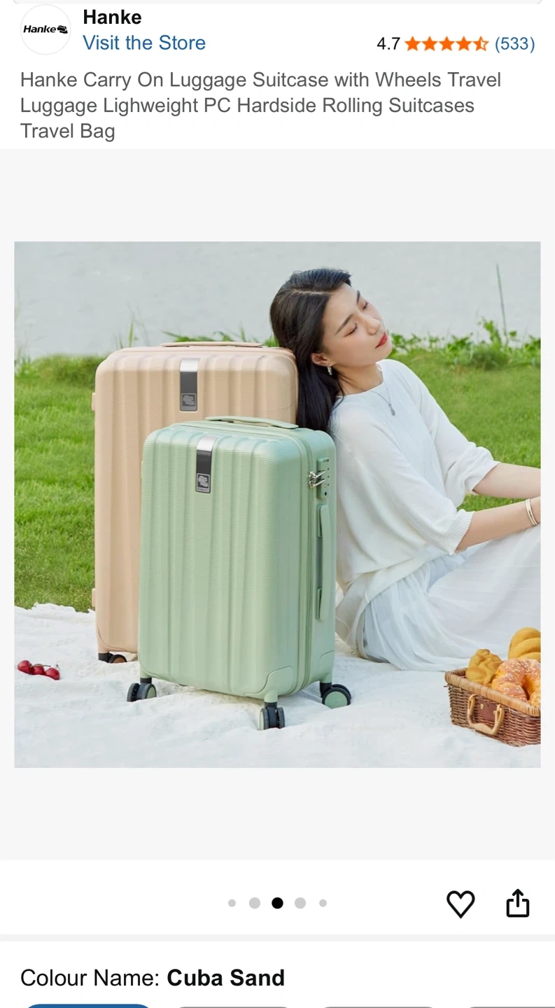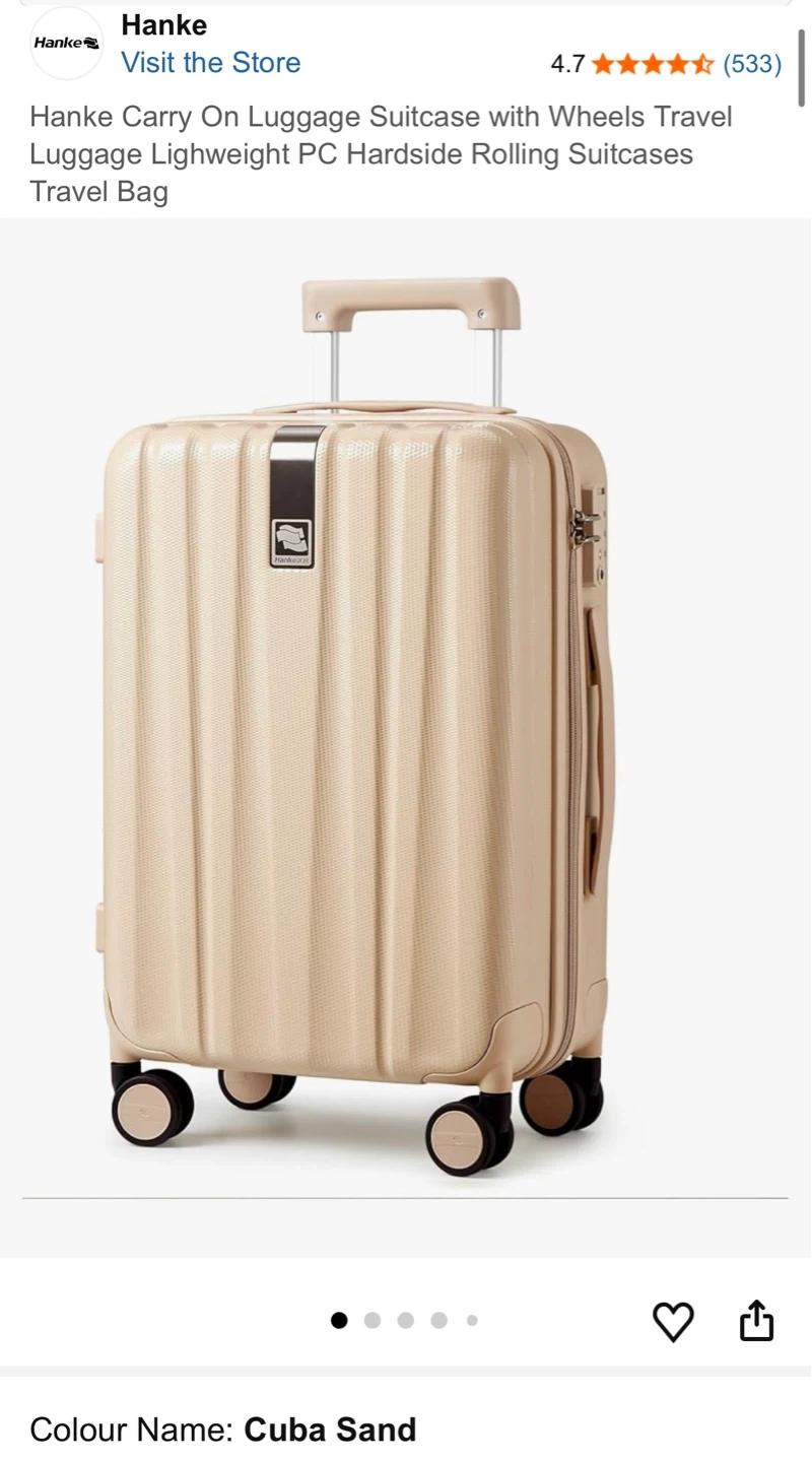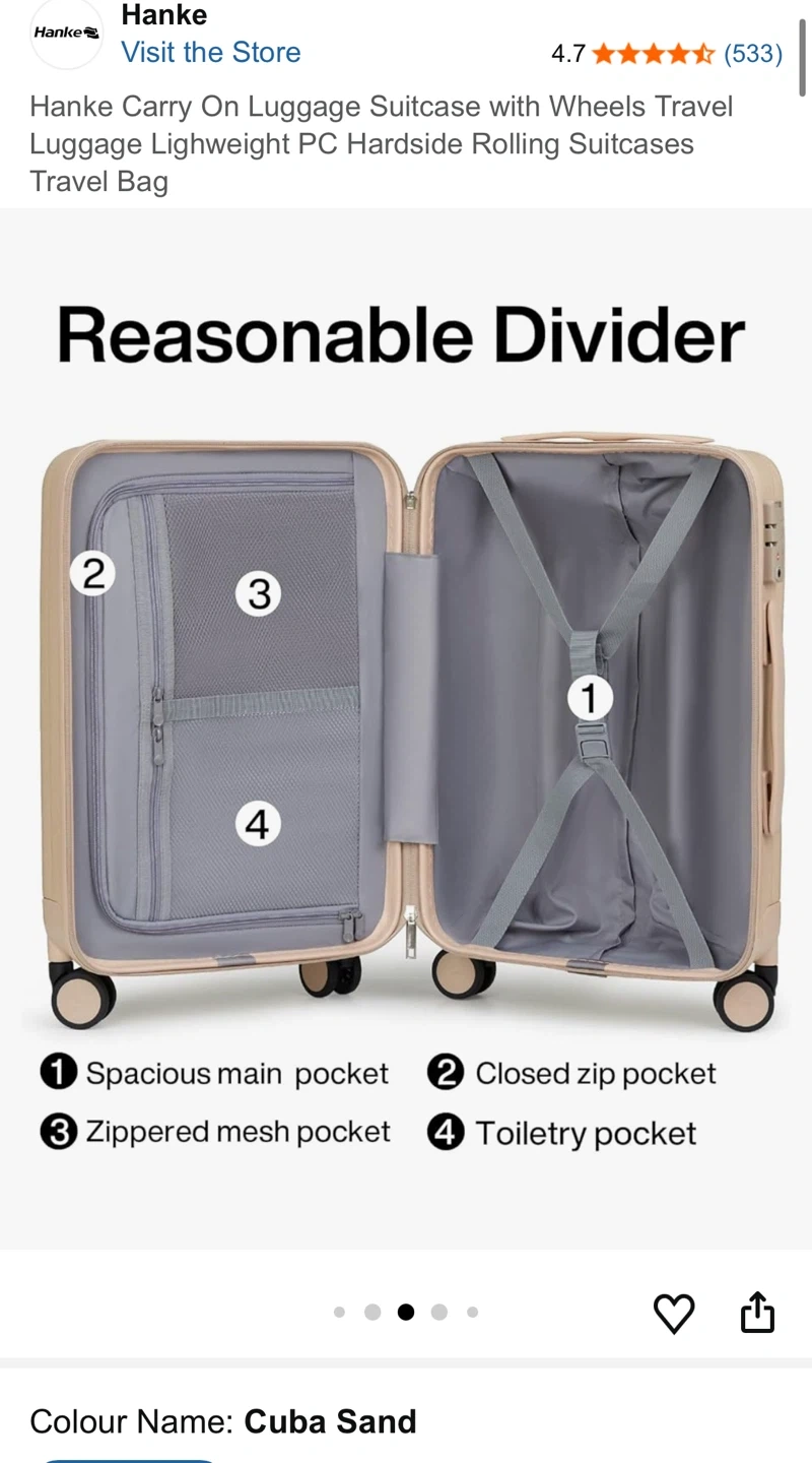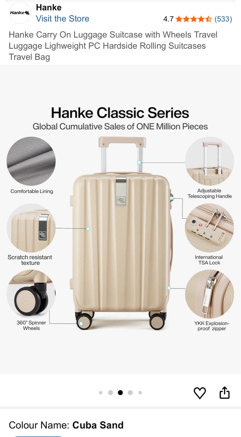 This Hanke carry-on suitcase is a lightweight PC hardside rolling travel bag. It features spinner wheels and an anti-scratch texture. The interior has a reasonable divider with multiple pockets for organization. Perfect for weekend trips or short business travel!
