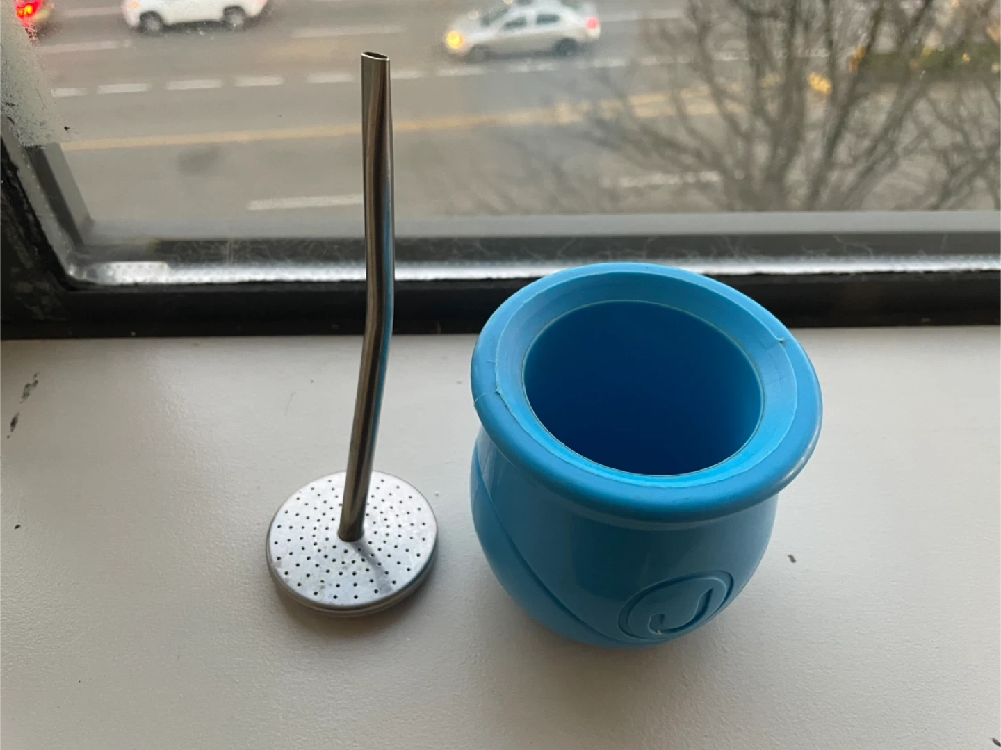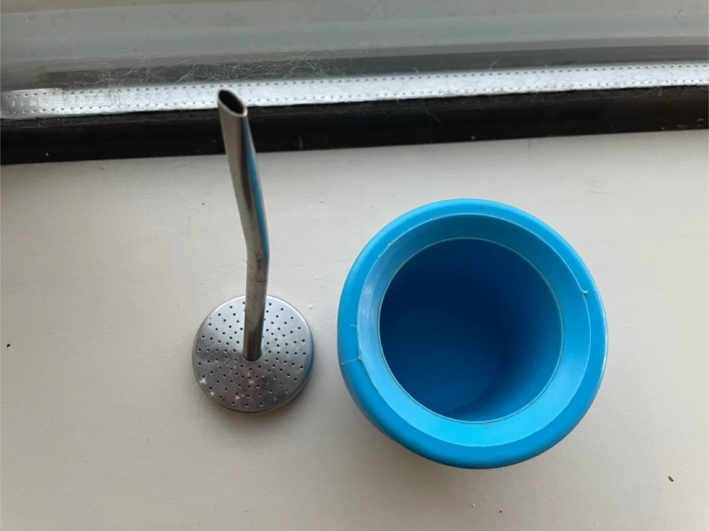 This is a blue gourd designed for drinking yerba mate. It includes a stainless steel bombilla for sipping. The gourd is made of plastic and the bombilla has a perforated filter.