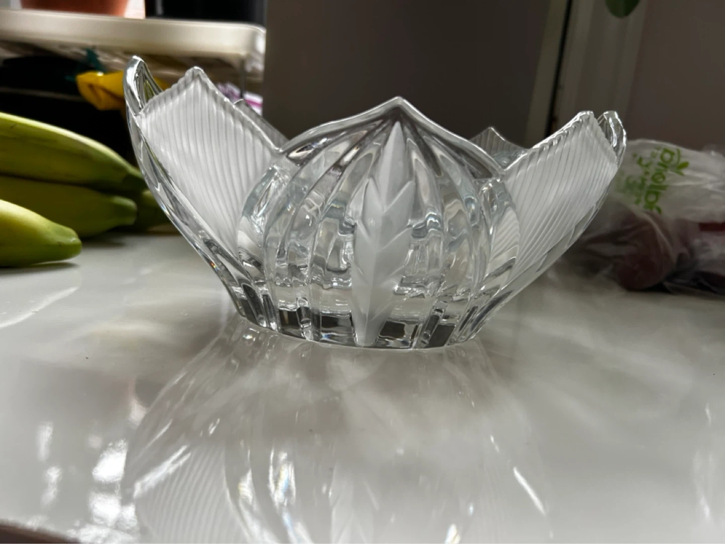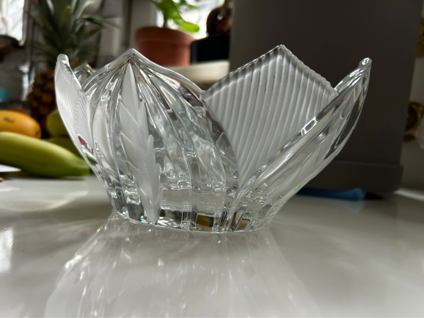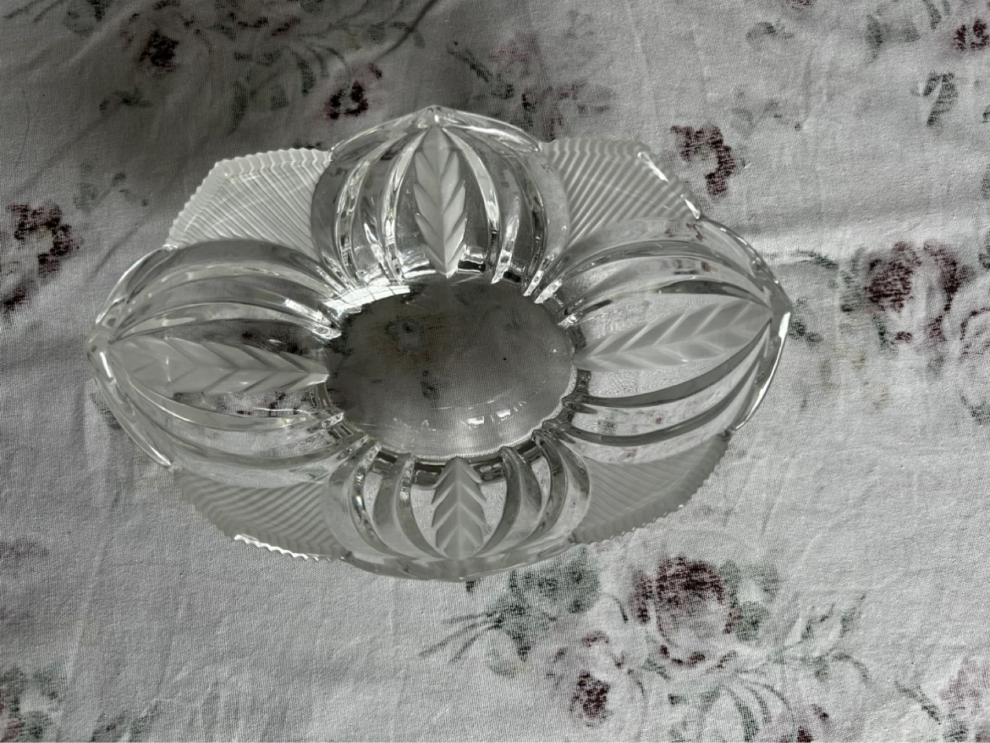 HEAVY & Beautiful real crystal glass bowl with a floral-inspired frosted design. Its elegant leaf patterns and fluted edges. Ideal beautiful gift.