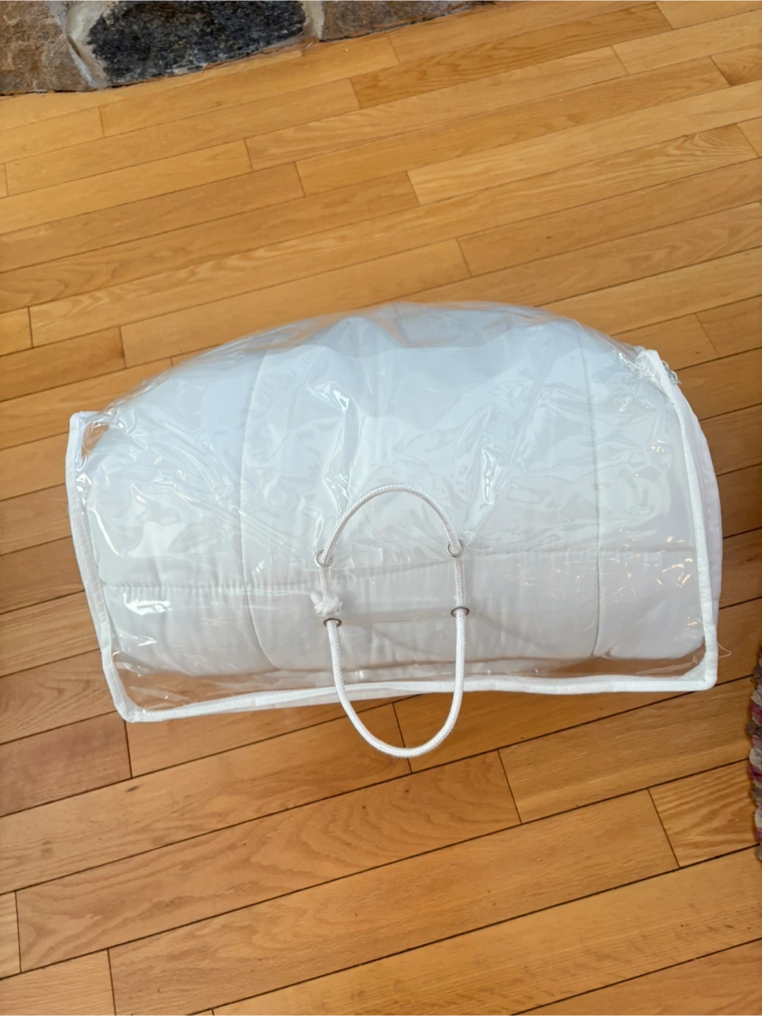 White duvet and sheet set. Quilted design. Comes in a clear protective bag with handles. Bag is perfect for storage!