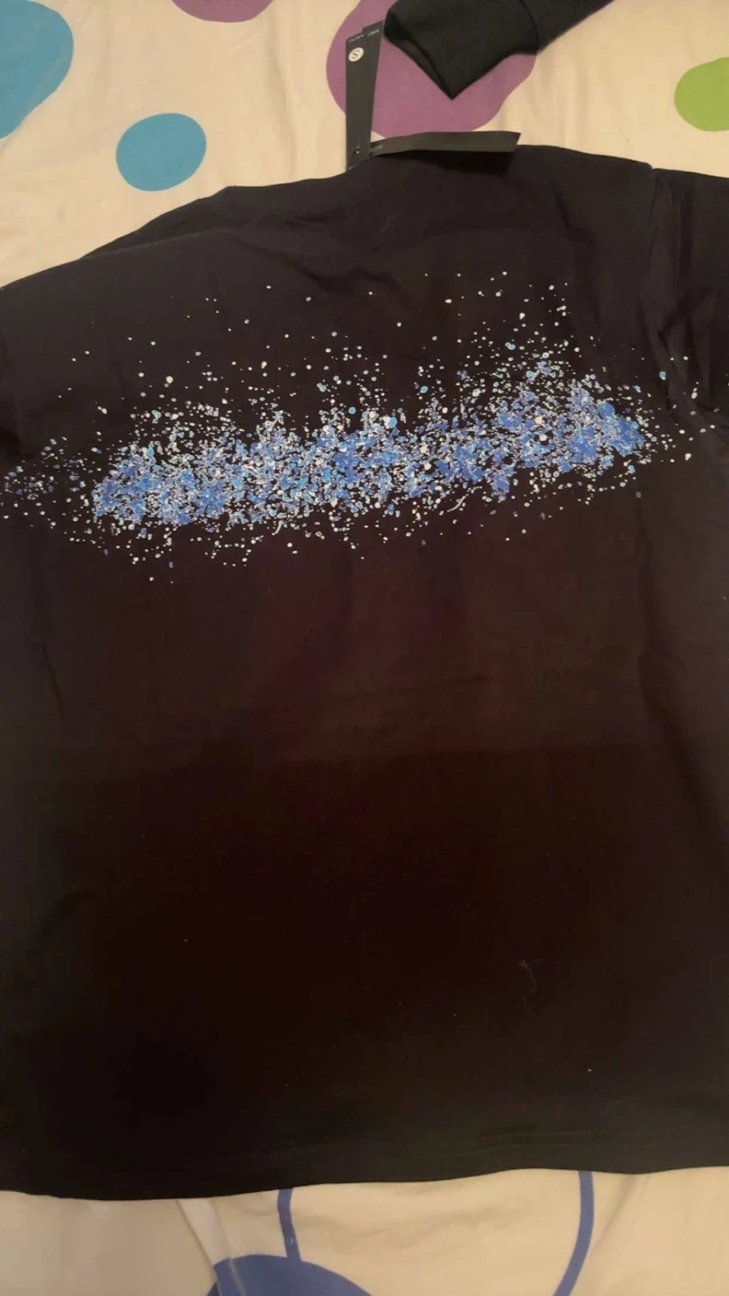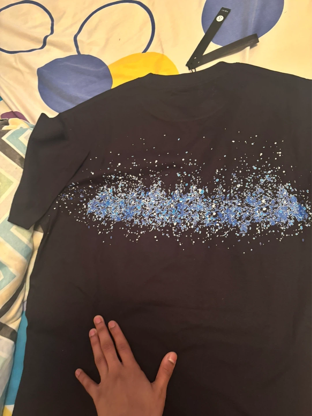 This is an Amiri t-shirt in black with a blue splatter graphic across the chest. It's a size medium. It has the Amiri logo printed in white, with a blue and white splatter design.