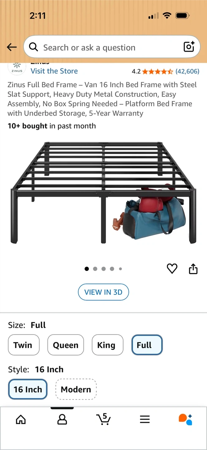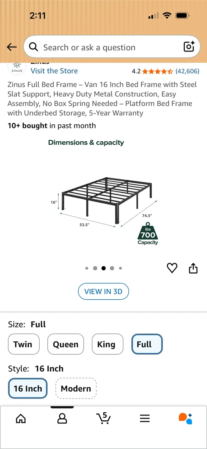 This Zinus Full bed frame features a 16-inch height with steel slat support and underbed storage. It has a heavy-duty metal construction and is easy to assemble. Its capacity is 700 lbs.