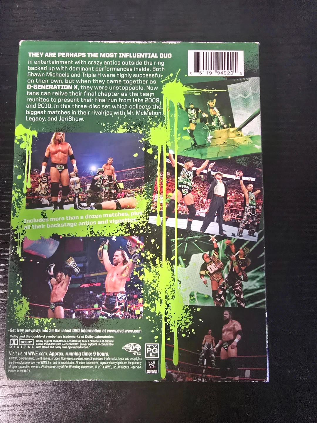 This is the WWE D-Generation X: One Last Stand 3-disc DVD set. It includes their reunion from 2009 and their final run from 2010. Running time is approximately 9 hours. Includes bonus content like backstage antics and matches!