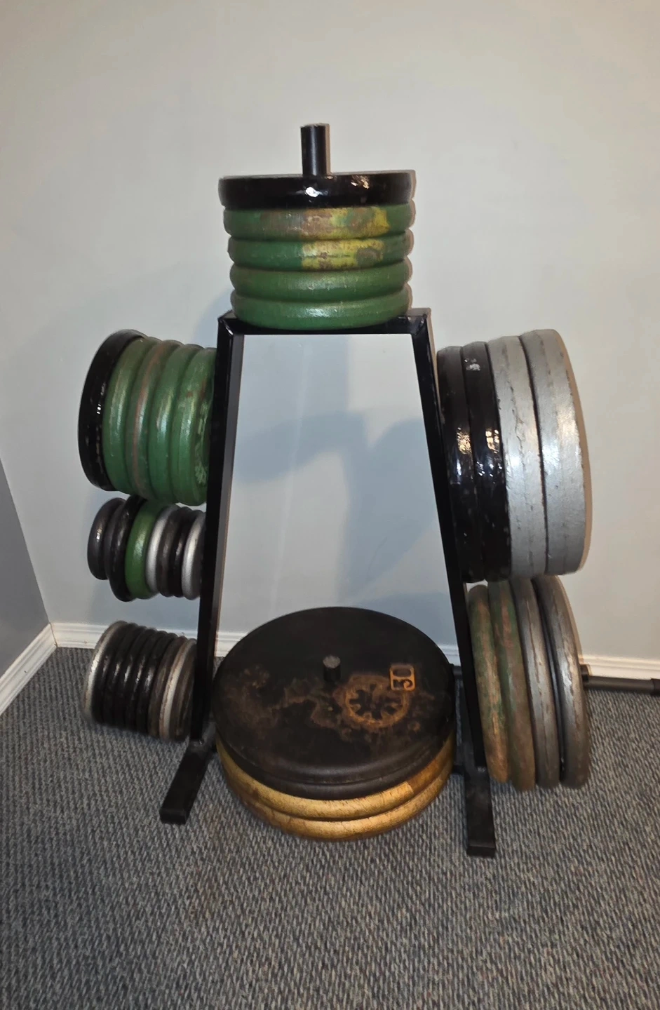 Includes a weight plate rack with various Olympic-style weight plates. Weights come in black, green, and silver. Some plates show wear, adding character!
