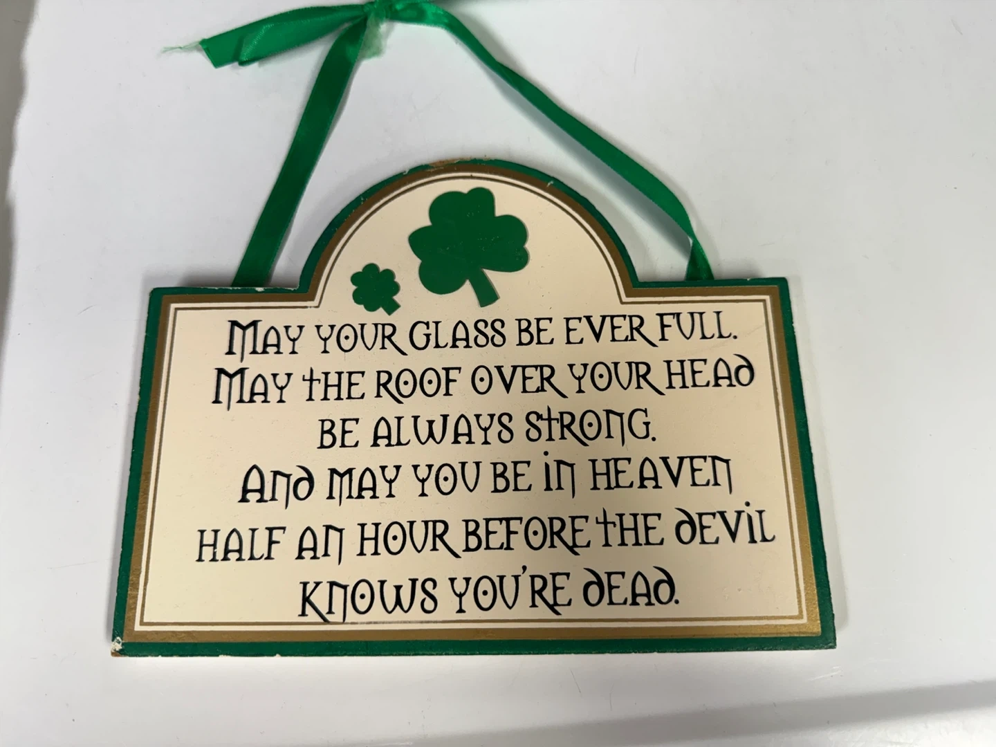 This decorative plaque features a popular Irish blessing. It's made of what appears to be wood with a green ribbon for hanging. The text reads 'May your glass be ever full...'.
