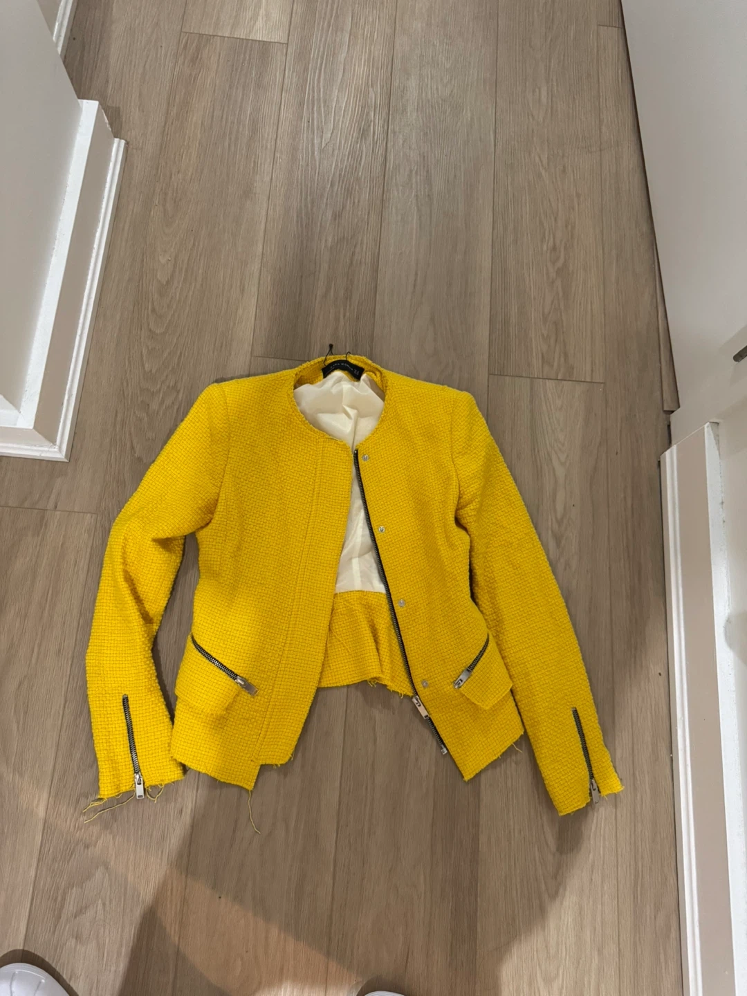 This is a bright yellow textured blazer with a cream-coloured lining. It features a zip-up front and zippered pockets on the sides. The sleeves have zippered cuffs.