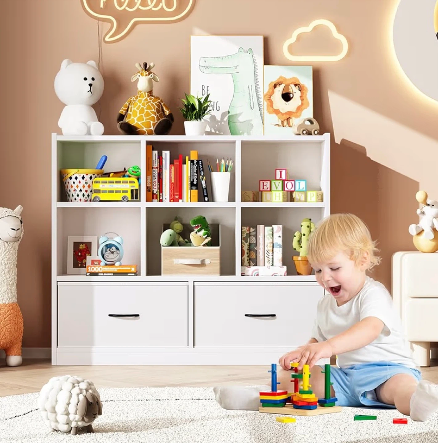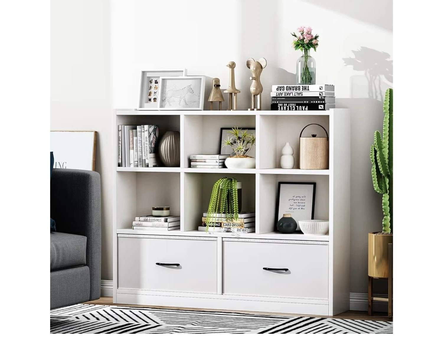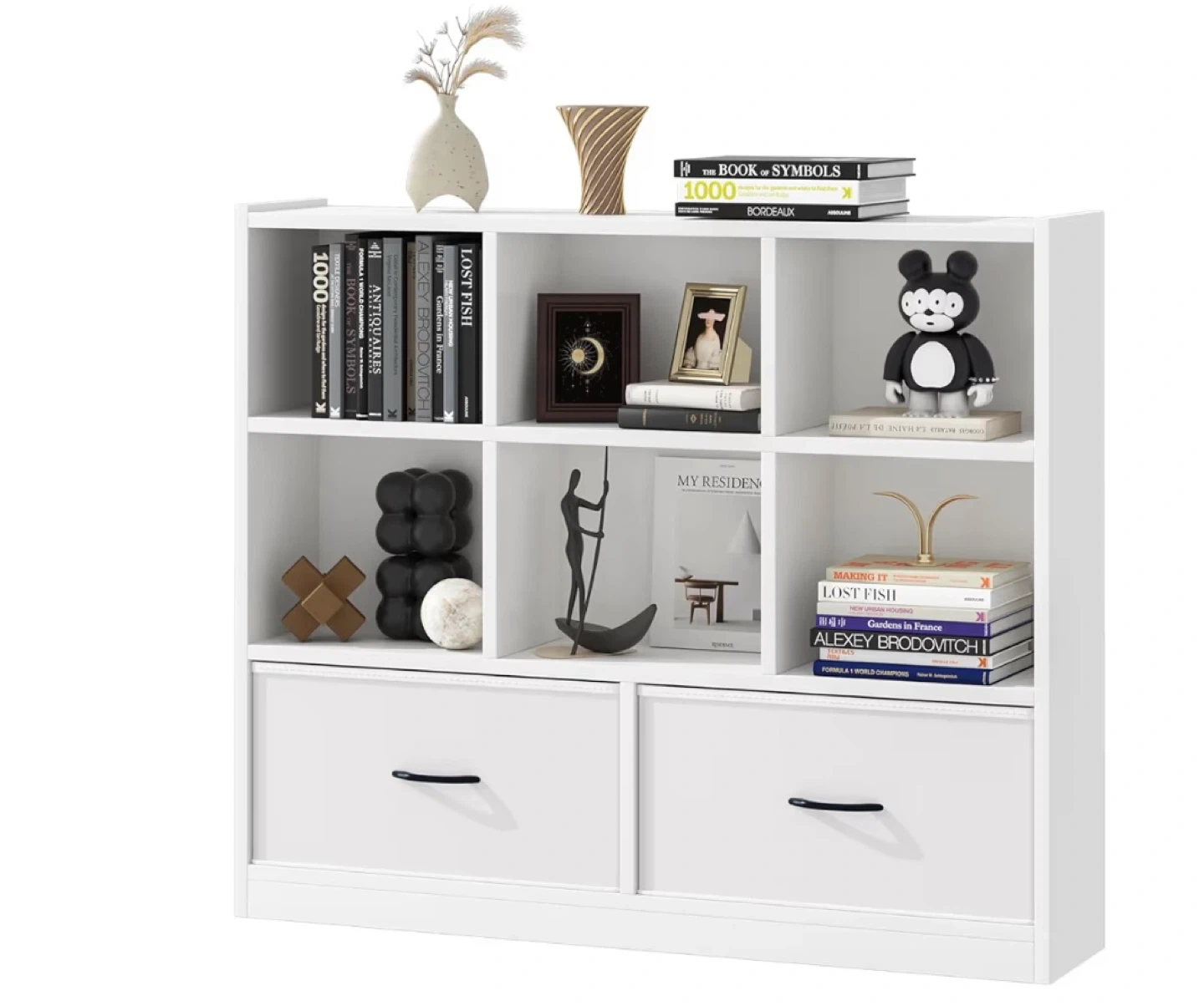 White 6-Cube Bookshelf with 2 Drawers