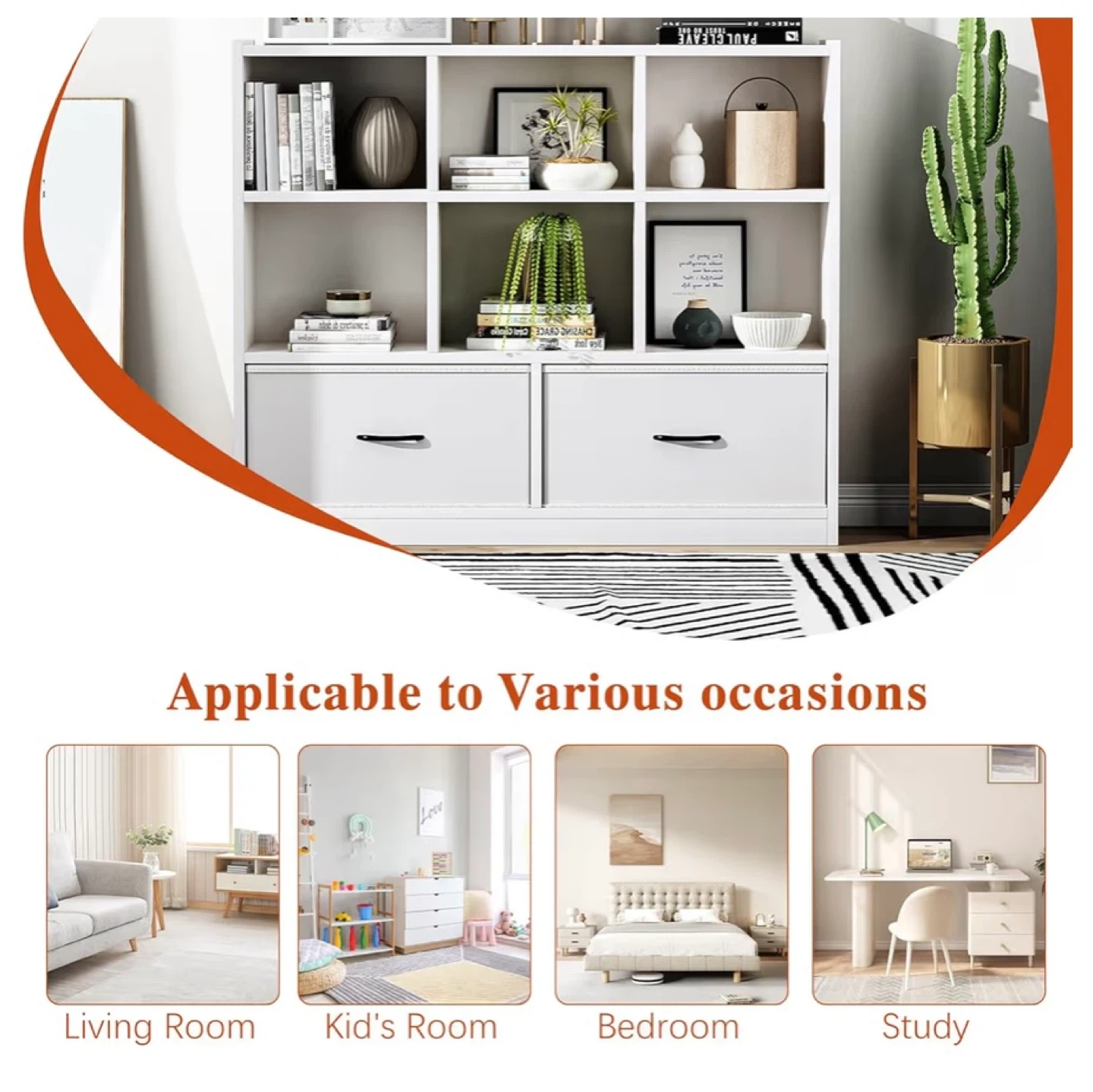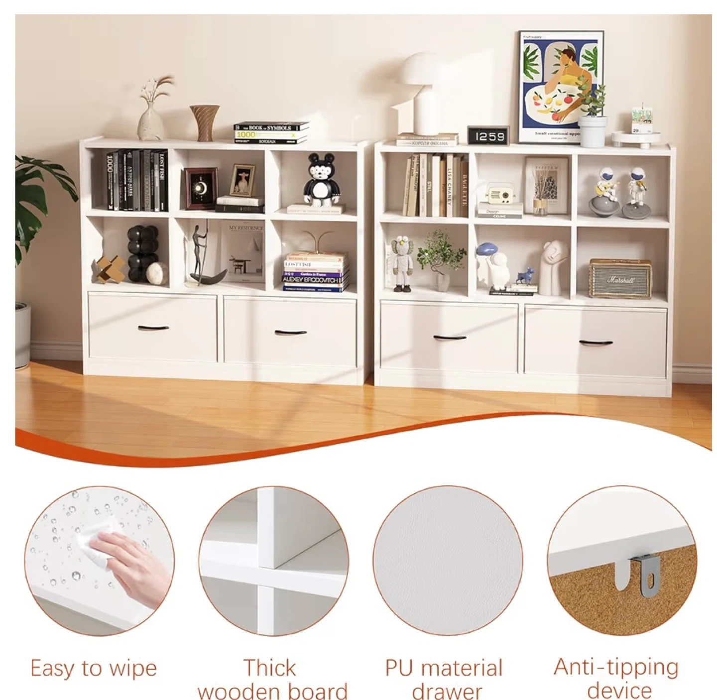 This white bookshelf features six open cubes and two drawers for storage. It's made with thick wooden board and has a PU material finish on the drawers. Includes an anti-tipping device for safety.