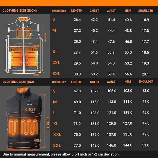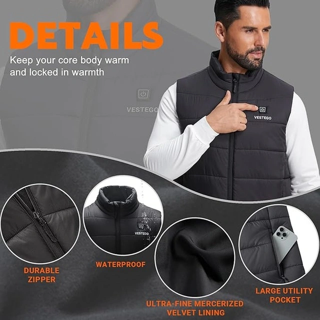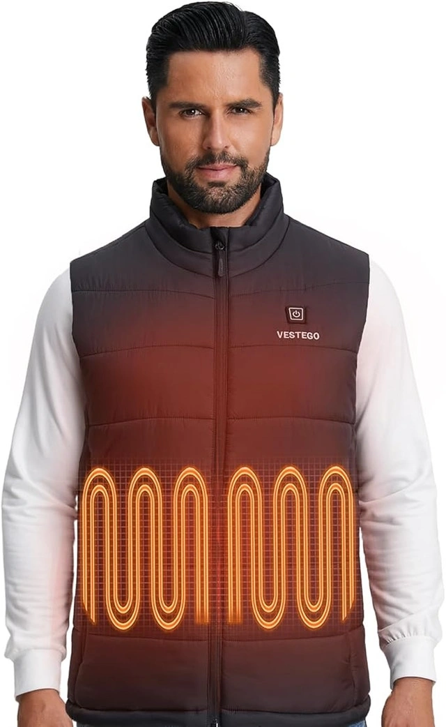 Product details Fabric type 100% Polyester Care instructions Machine washable (line dry) Origin Imported About this item Quick Heating & Long-Lasting Warmth: Connect the battery pack first, then press and hold the power button for 3 seconds to turn on this VESTEGO heated vest. It automatically starts in high heat mode (red light) for rapid warmth. Powered by a 16,000mAh rechargeable battery, this heated vest with battery pack included delivers up to 4 hours on high, 7 hours on medium, and 10 hours on low—keeping you comfortably warm all day. 6 Heating Zones & 3 Adjustable Levels: This heated vest for men features 6 heating areas for full-body warmth. Three temperature settings—High (140°F, red), Medium (122°F, white), and Low (104°F, blue)—let you adjust the warmth to your needs. A built-in safety feature automatically shuts off the men’s heated vest after 3 hours of inactivity for added safety. Sleek Design & Premium Materials: Crafted with a durable 20D double-stitched nylon outer shell (black) and a soft polyester lining, filled with hollow fiber (silk-like polyester) insulation for lightweight warmth and comfort, this men’s heated vest combines style and functionality. Perfect for skiing, hiking, hunting, cycling, or camping, its sleek design stands out among other heated jackets for men. Multiple Certifications for Safety: This heated jacket for men has earned CE-EMC, FCC, ROHS, and UL2056 certifications, ensuring reliable quality and safety. Wear your heated vest with confidence in any outdoor adventure. Easy Care & Maintenance: The high-quality heating elements and durable construction of this heated vest with battery pack included allow it to be safely machine washed in cold water. Remove the battery and cover the DC connector before washing. Place the heated vest in a laundry bag and air dry.