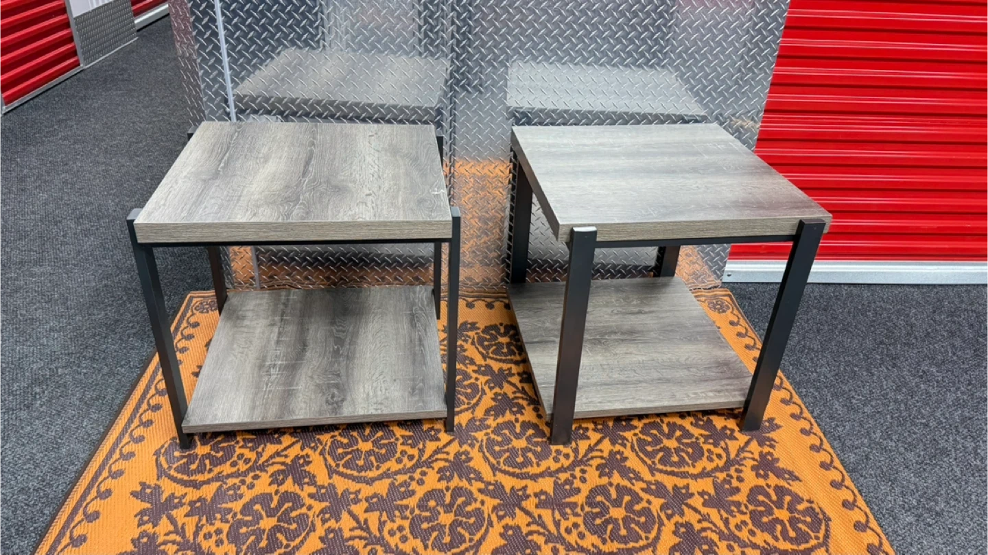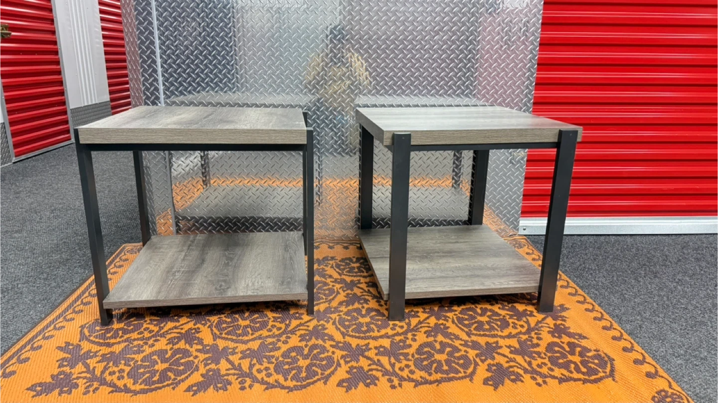 Selling a set of two modern end tables. Each table features a wood grain laminate top and shelf with a sturdy black metal frame. They're perfect for a living room
