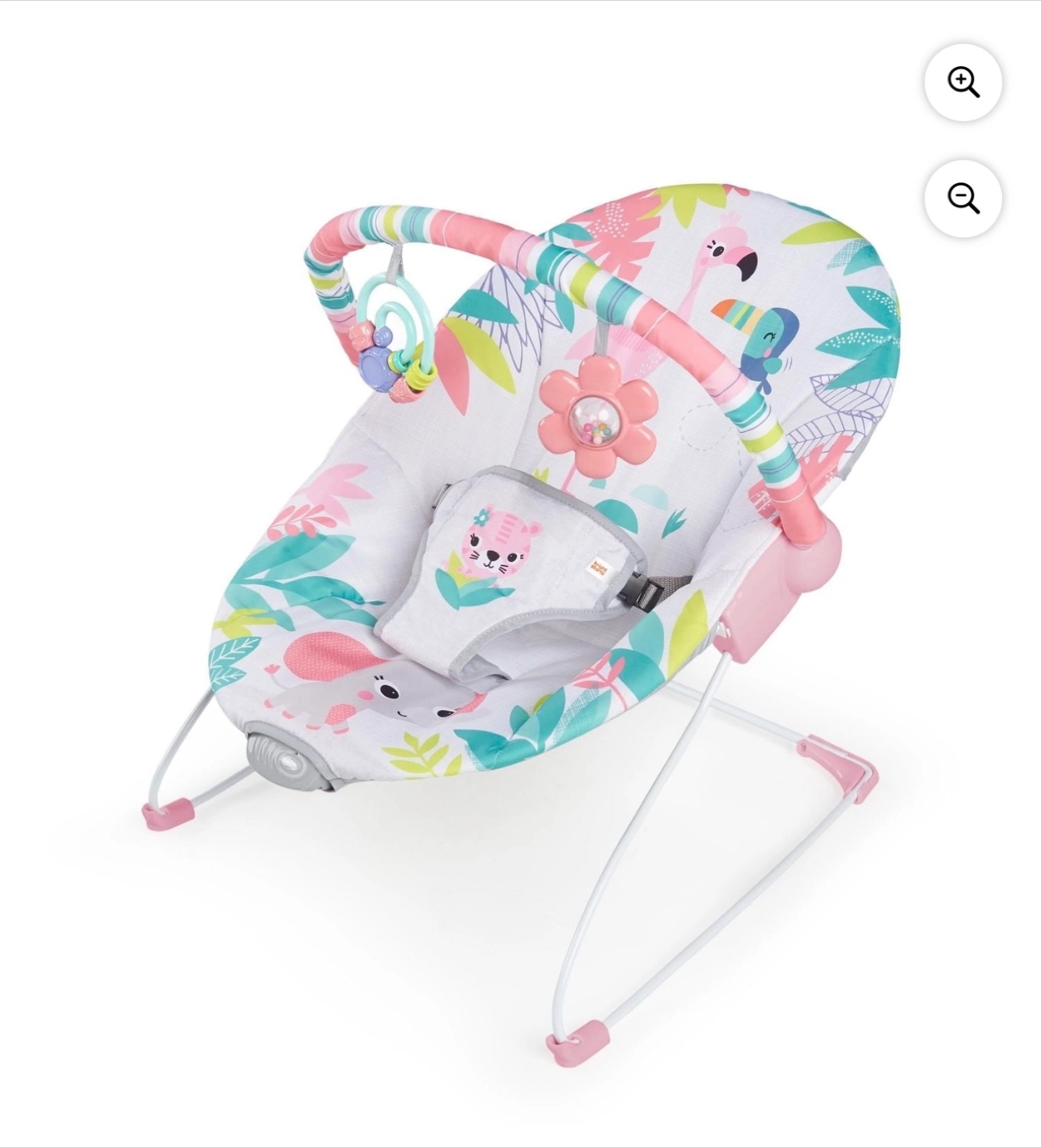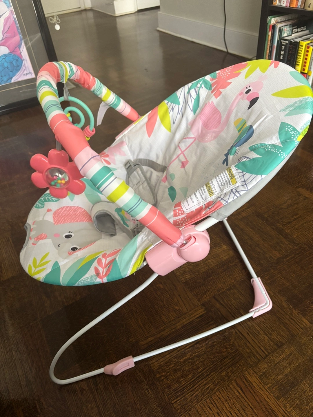 Selling a Bright Starts baby bouncer in great condition! Features a cute flamingo and elephant design with attached toys to keep your little one entertained. It's lightweight and easy to move around the house