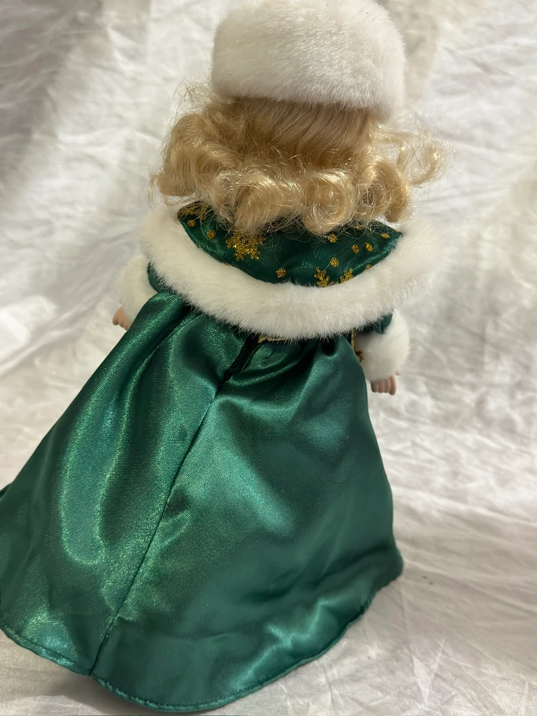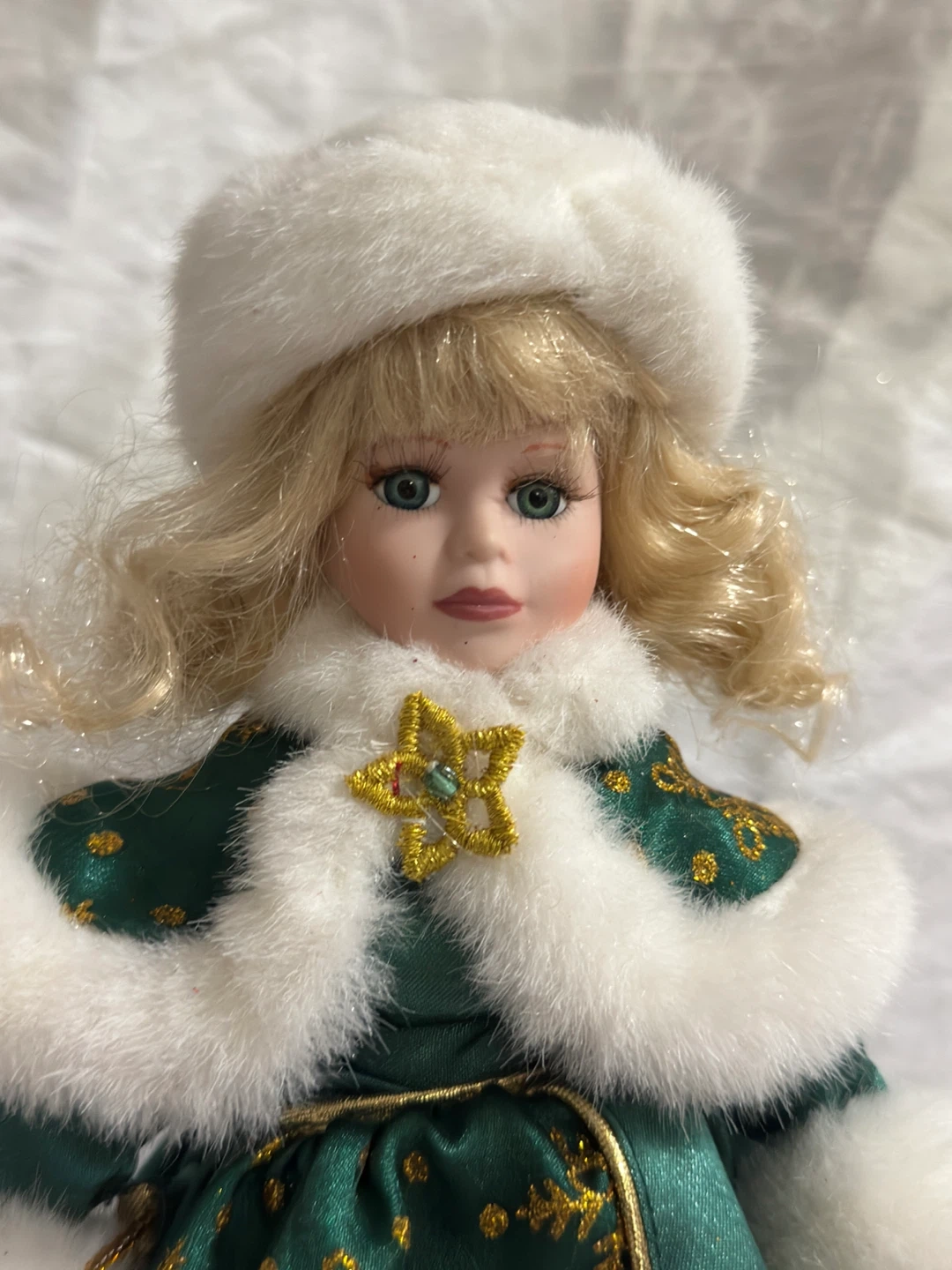 This is the Avon 2001 Holiday Radiance Special Memories Christmas porcelain doll Lorriane. She's dressed in a beautiful green satin gown with gold snowflake accents and a white fur-trimmed cape and hat. It's a lovely collectible piece for the holidays!
