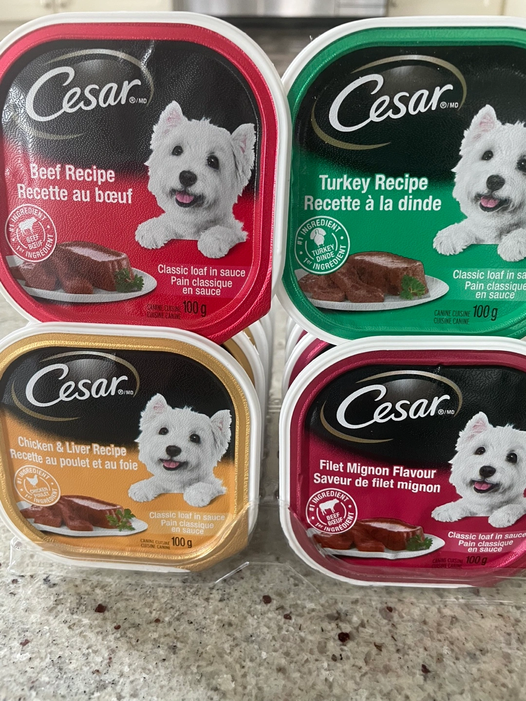 100g single-serve trays of Cesar dog food. Flavours include Beef, Turkey, Chicken & Liver, and Filet Mignon.