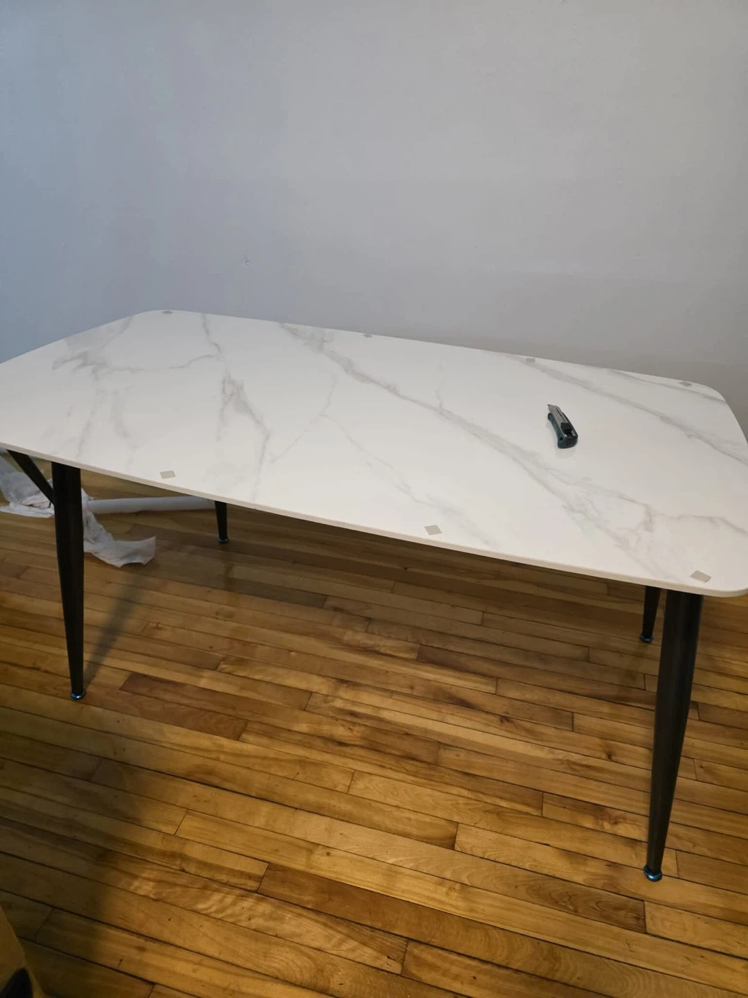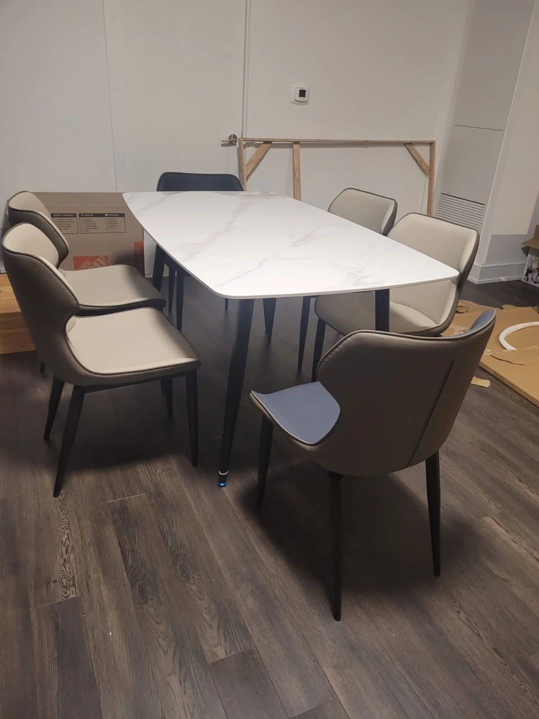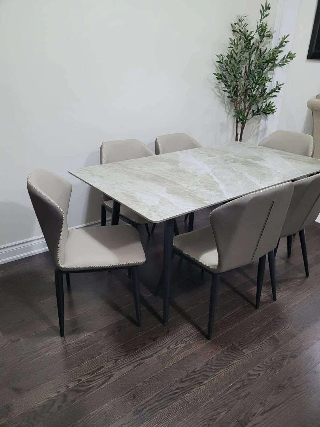 A modern dining set featuring a sleek table with a stone-look finish and six upholstered chairs. This set comfortably seats six people and is suitable for family meals or entertaining guests.