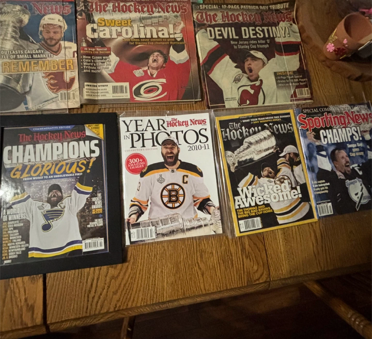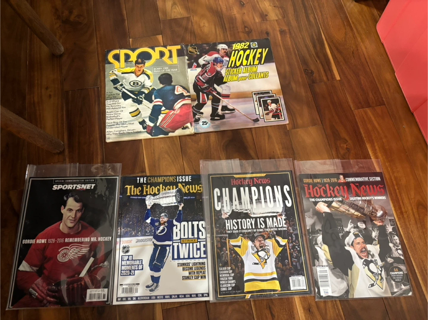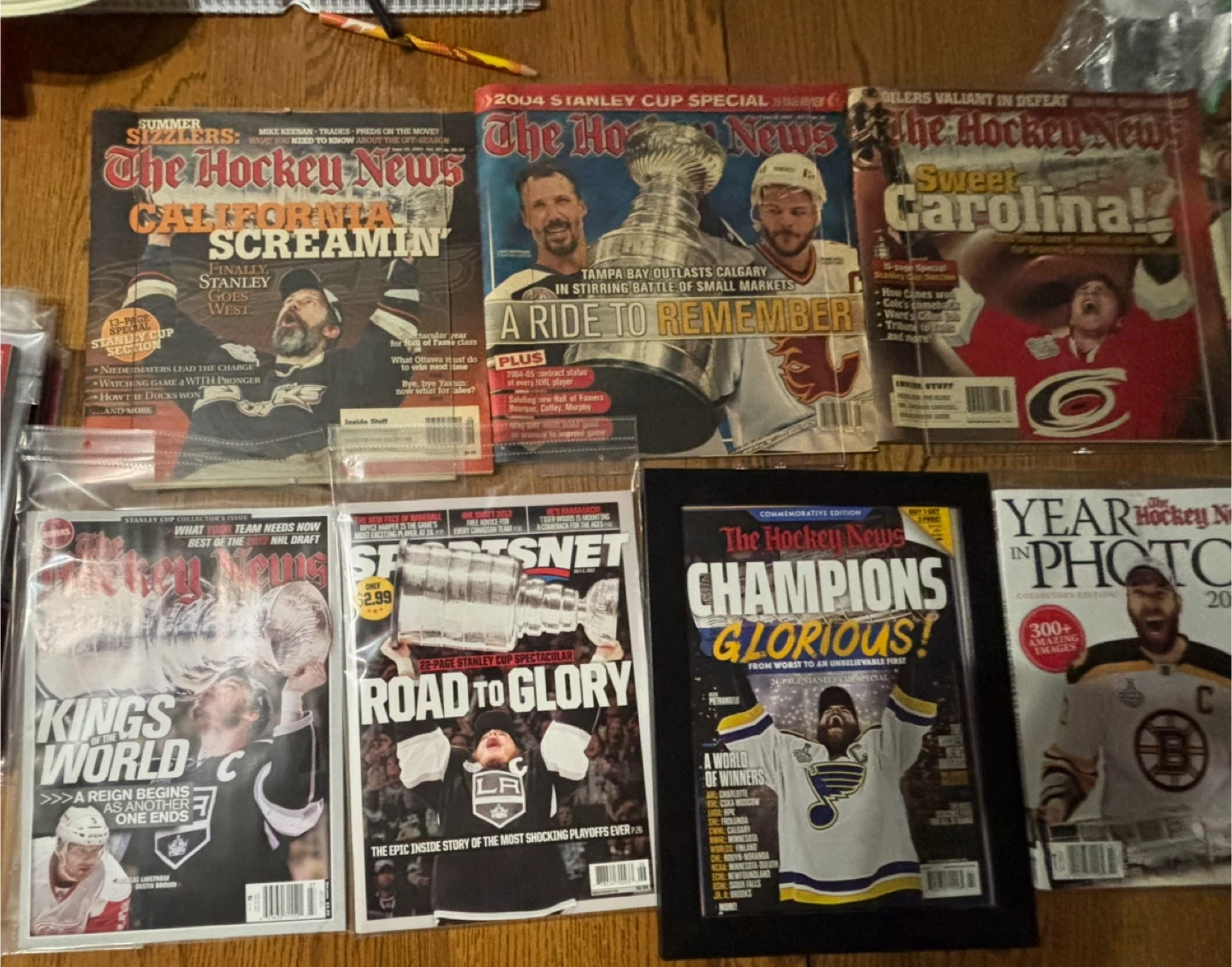 This is a collection of assorted hockey magazines, including The Hockey News and Sports Illustrated. Issues cover various Stanley Cup wins and notable players. These publications are perfect for any dedicated hockey fan wanting to revisit past seasons and celebrate iconic moments.