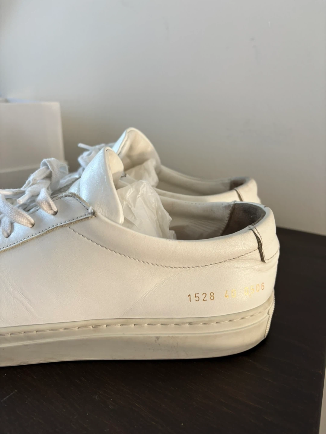 Common Projects Achilles Low sneakers in white leather. These are a size 40, EU. They come with the original box and dust bag. They're classic, clean sneakers.