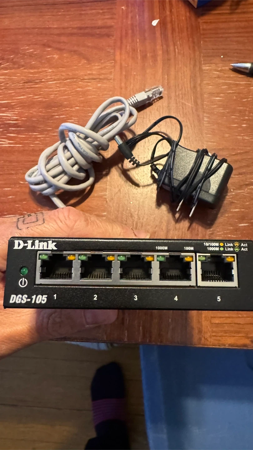 This is a D-Link DGS-105 5-port Gigabit network switch. It includes a power adapter and an Ethernet cable. The switch has 10/100M and 1000M ports for flexible connectivity. It's a handy device for expanding your home or office network!