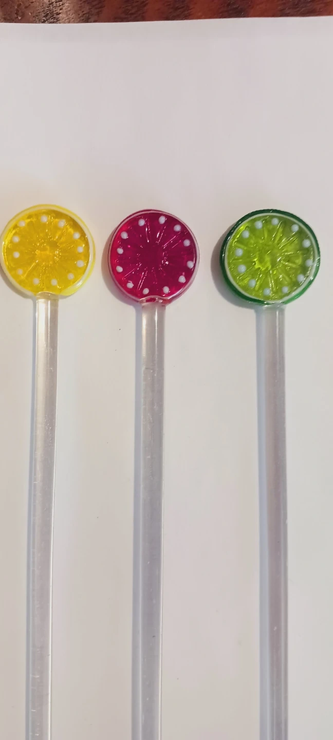 New !! These colorful glass Martini/drinks stirrers feature colorful fruit slice designs. Each stirrer has a colorful glass stick topped with a round disc. Comes in yellow, pink, and green.