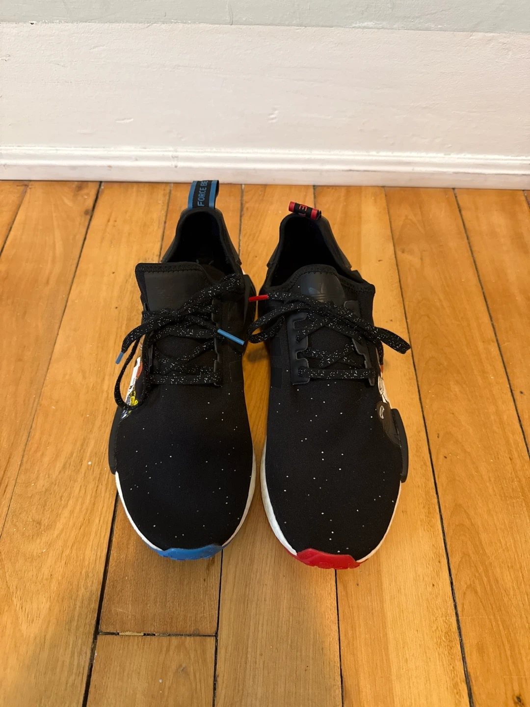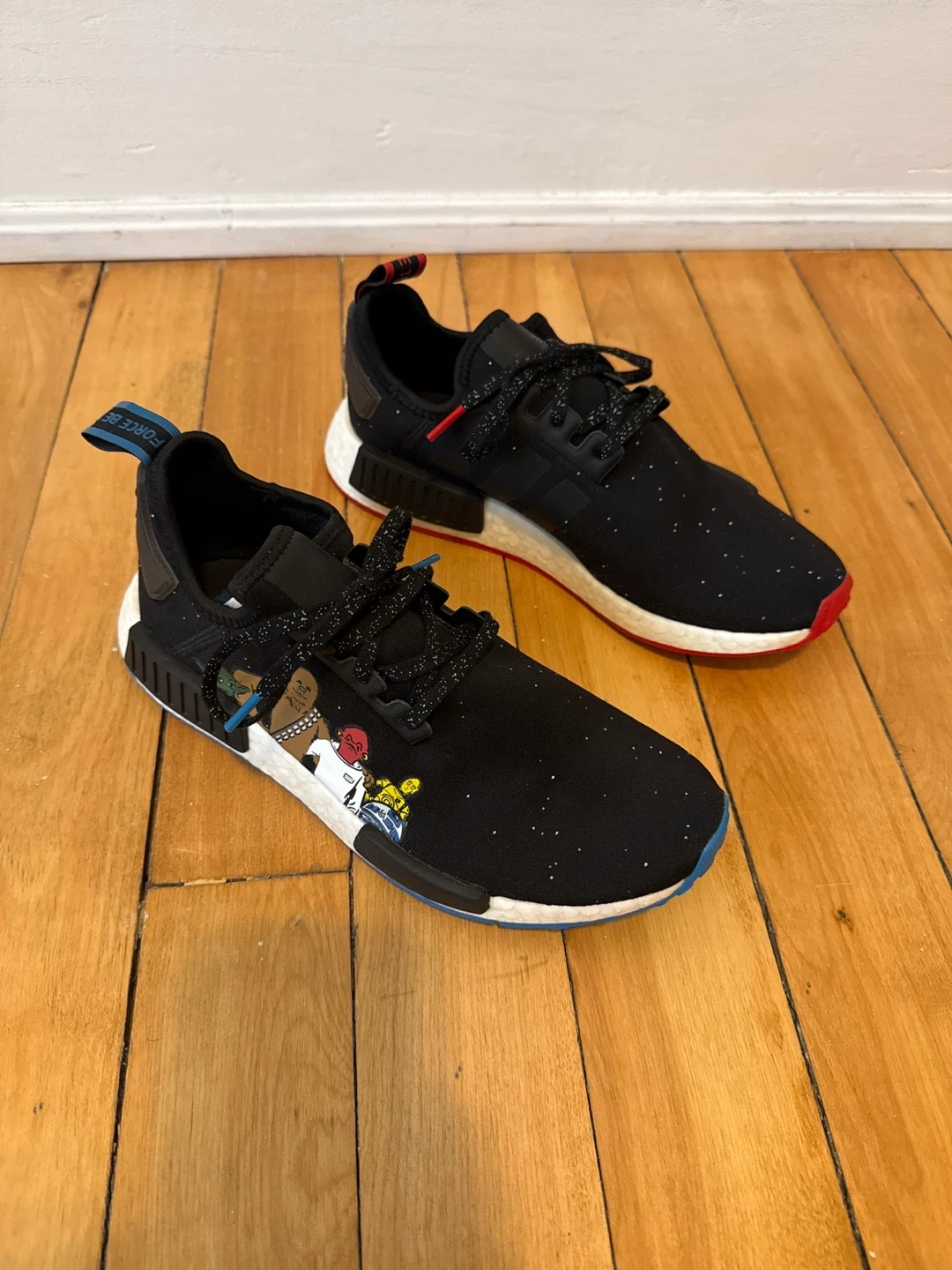 Adidas NMD R1 sneakers aStar Wars collab. Black knit upper with speckled detailing and character graphics. Boost midsole for comfort. Rubber outsoles. Never worn but there is some dye transfer on the back of the left shoes.