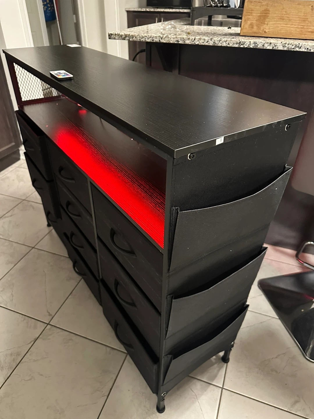 This black dresser features multiple drawers for storage and includes RGB LED lighting that can be controlled with a remote. It has a modern design with fabric side pockets.