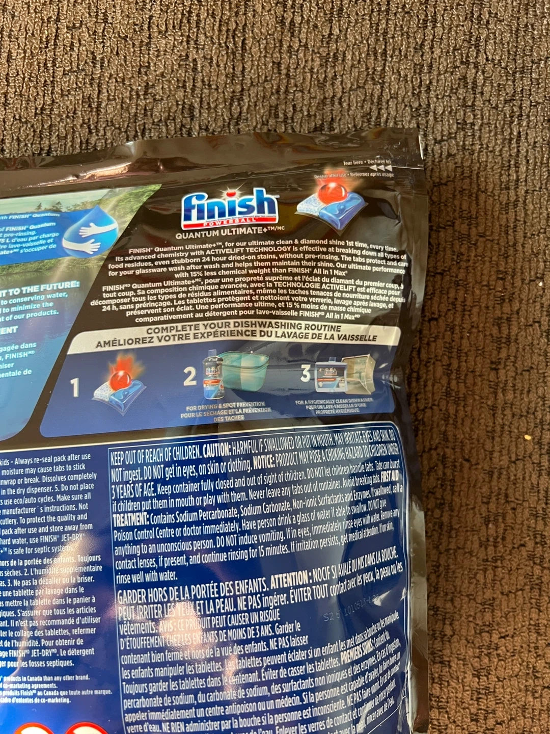 Selling a 48-count package of Finish Quantum Ultimate Powerball dishwasher detergent tablets