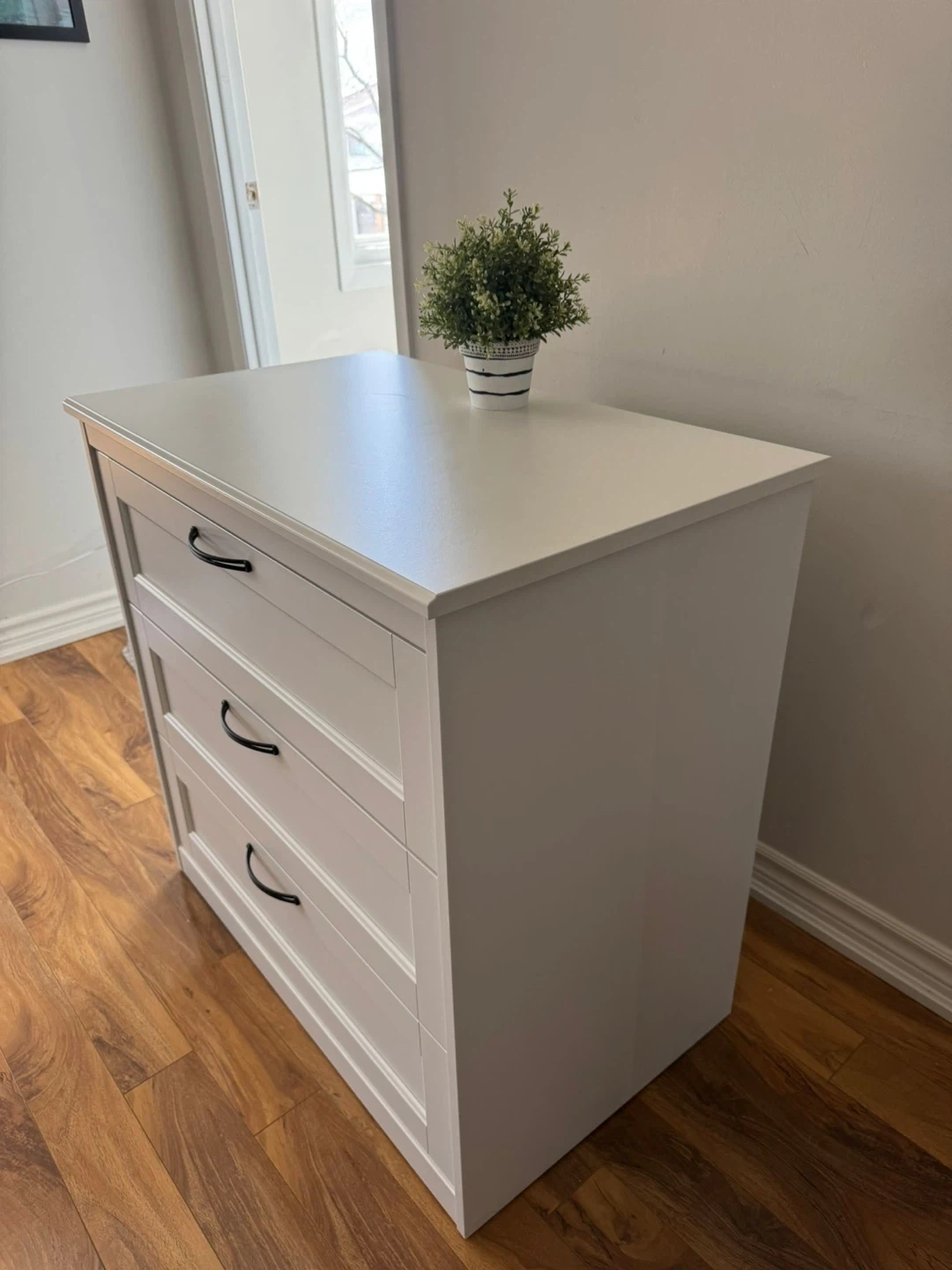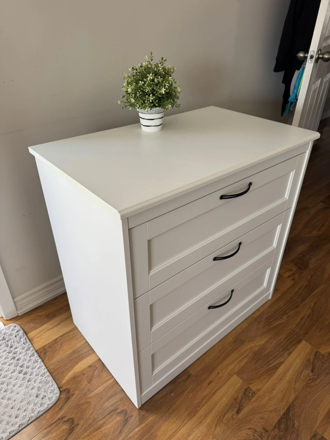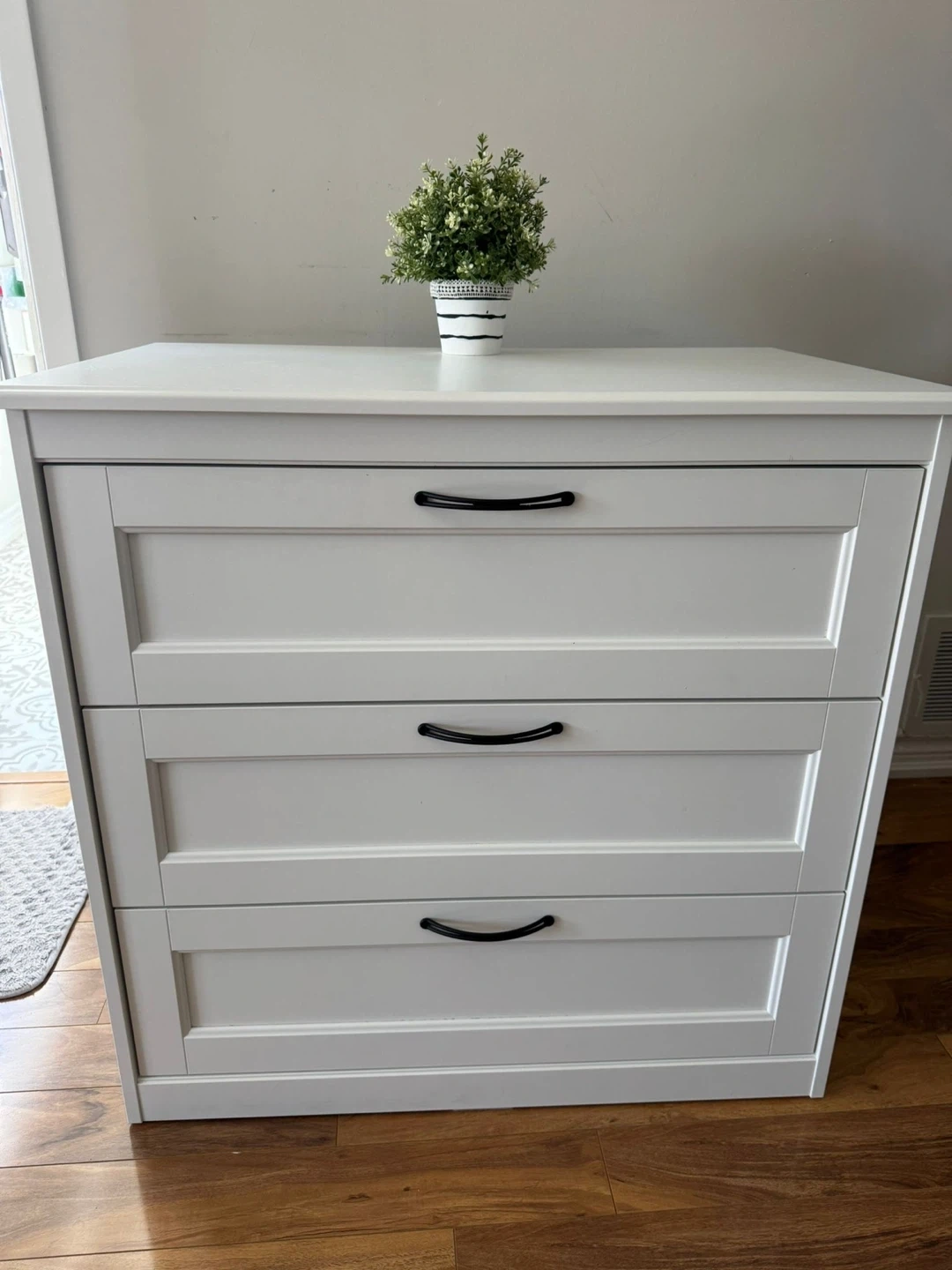 Beautiful IKEA 3-drawer dresser in white with black bar handles and classic shaker-style drawer fronts.