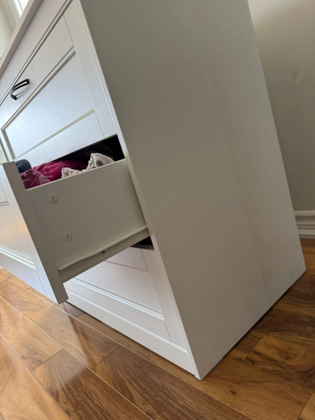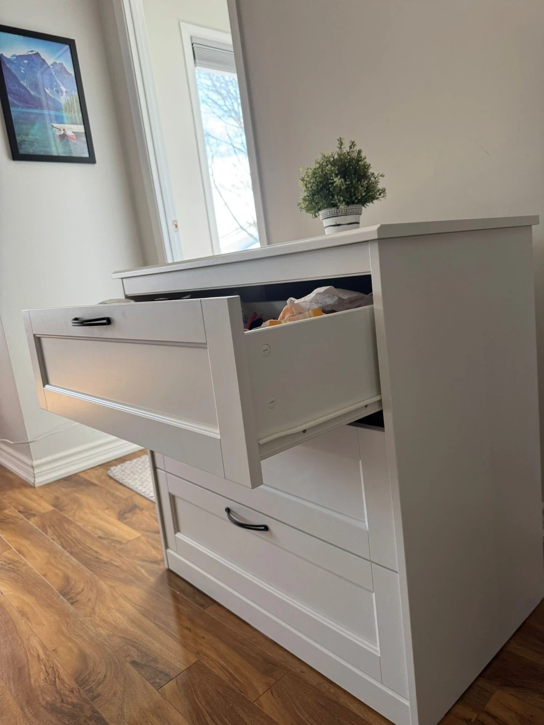 Sturdy construction with deep drawers — great for a bedroom, nursery, or hallway. Looks almost new with clean surfaces and smooth drawer action.