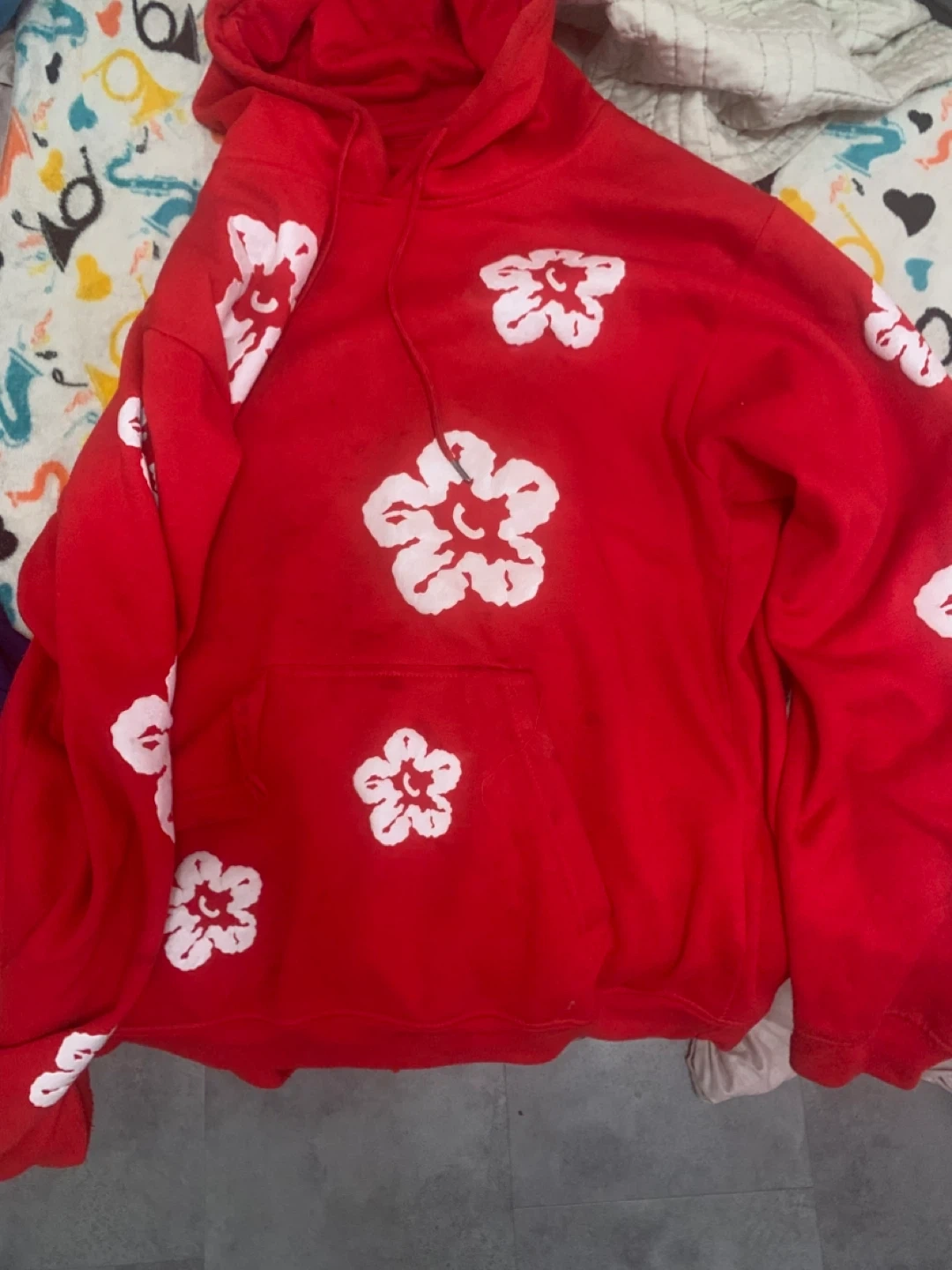 Selling a red BAPE shark hoodie! It features the iconic shark design on the front and floral patterns on the back and sleeves. It's in good condition and ready for a new home