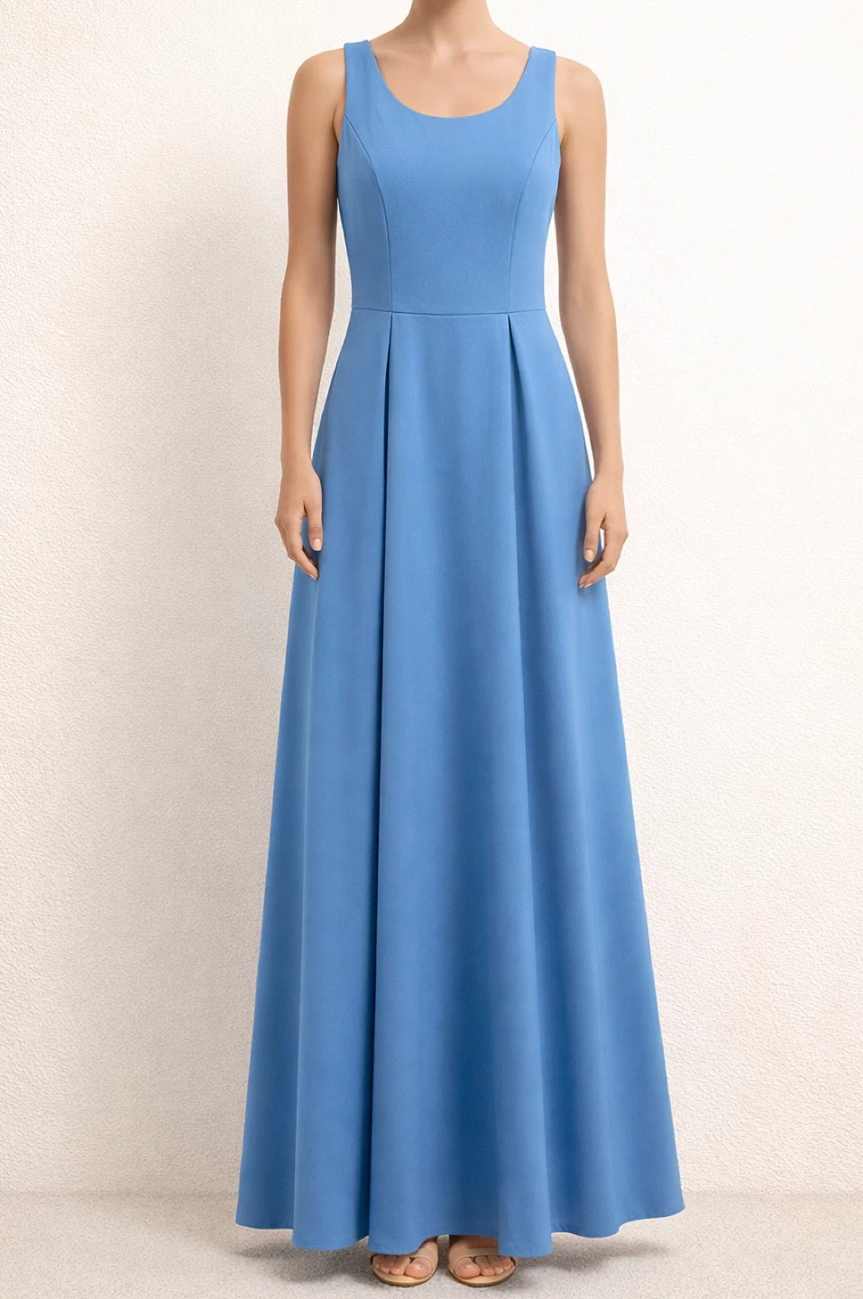 A beautiful blue sleeveless maxi dress with a fitted bodice and a pleated skirt. It features a scoop neckline and a concealed zipper closure at the back. Dress length is approximately 53 inches.