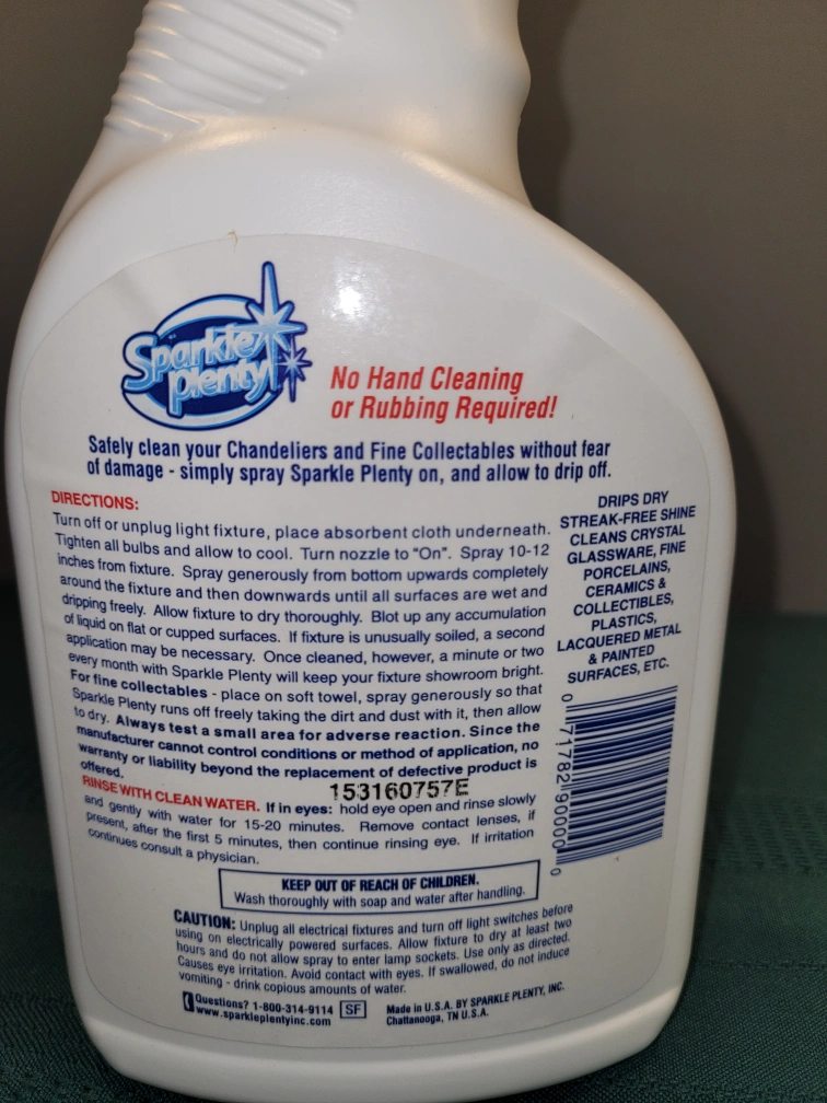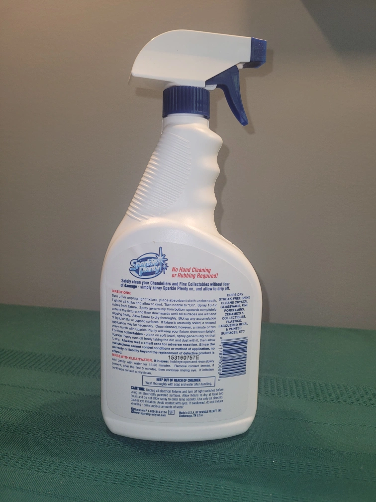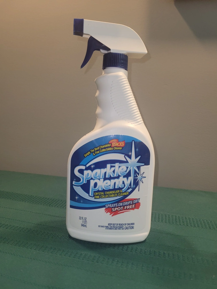 Reduced! A bottle of Sparkle Plenty Crystal Chandelier & Fine Collectibles Cleaner. 32 oz. I have multiple bottles. From the label: Chandelier and Fine Collectible cleaner.