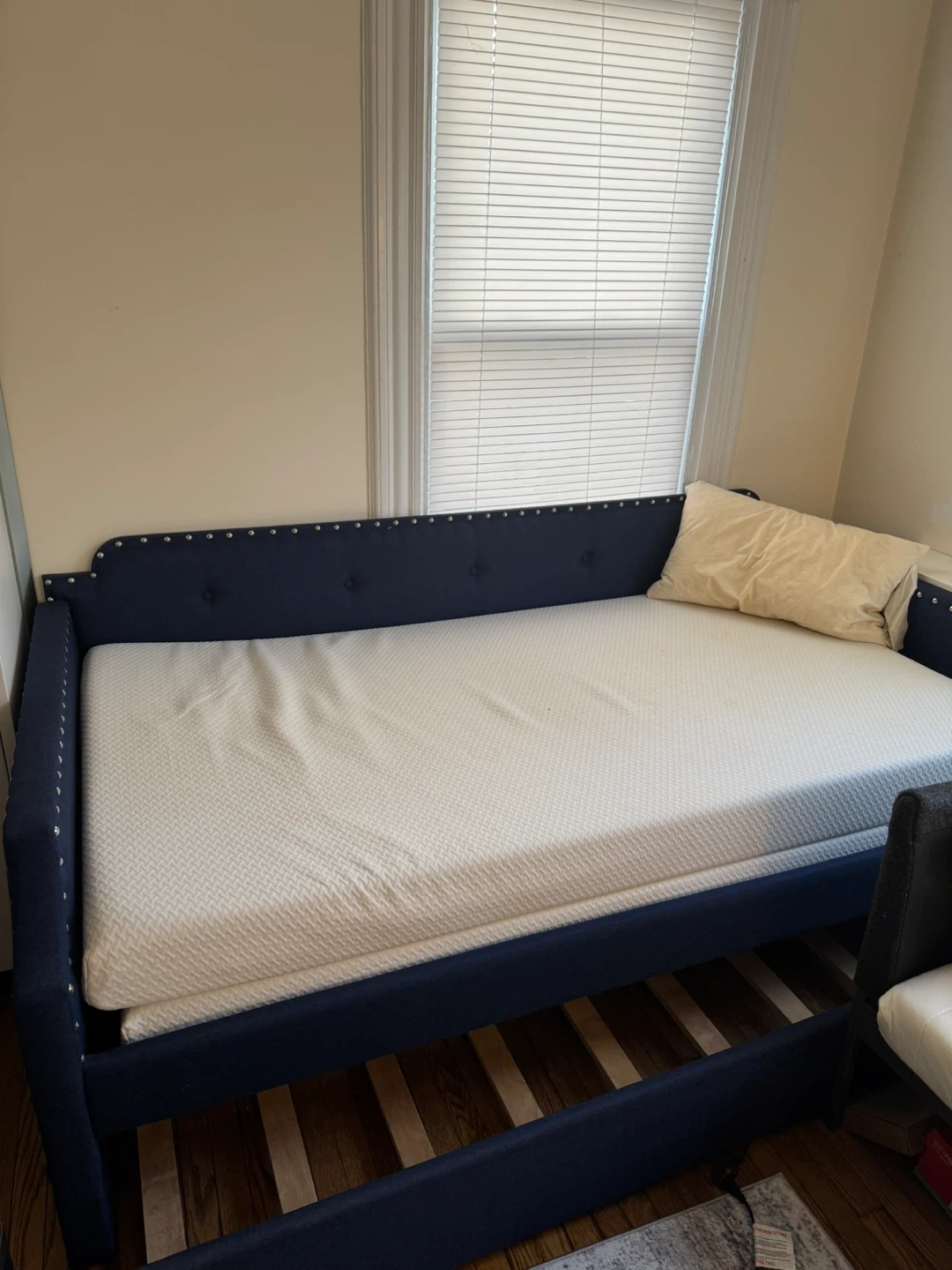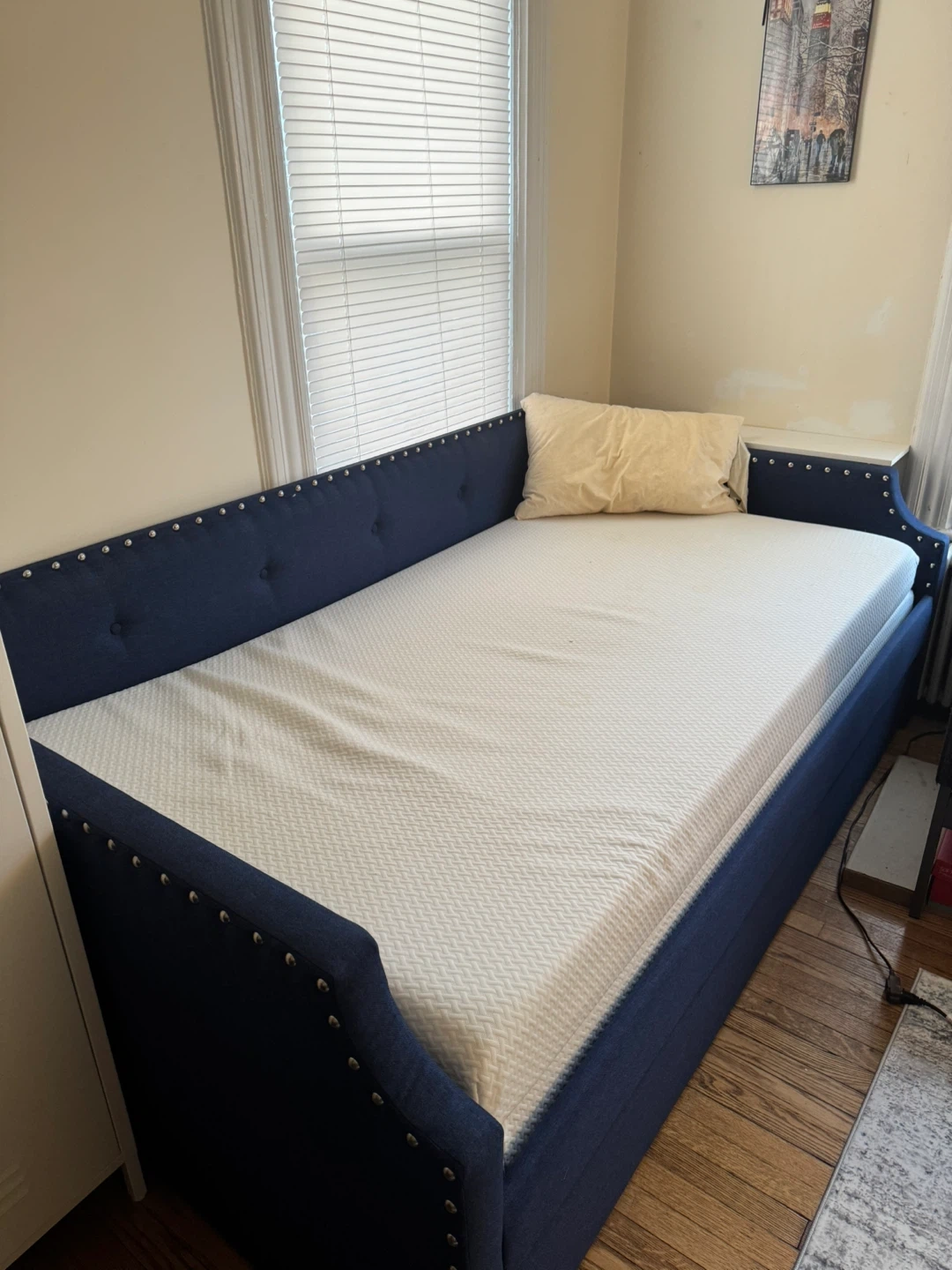 This daybed features a deep blue upholstered frame with decorative studded trim. It includes a white mattress. Its design makes it a versatile piece for seating or sleeping.
