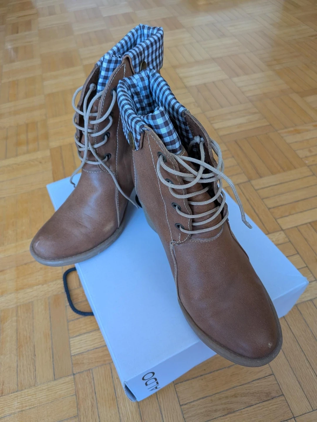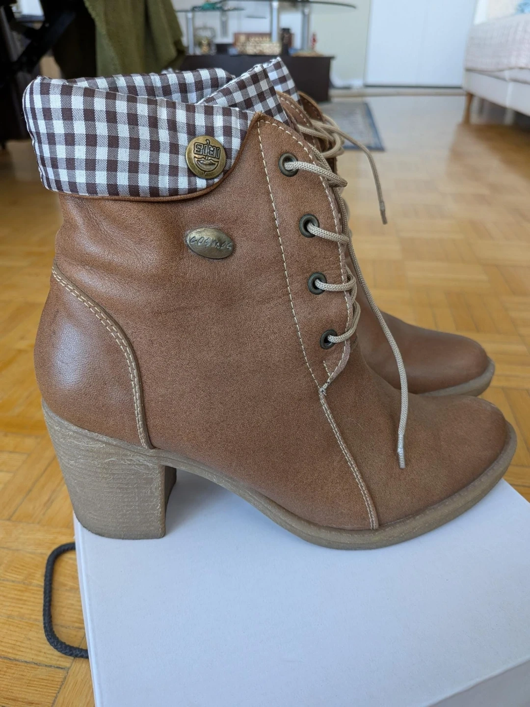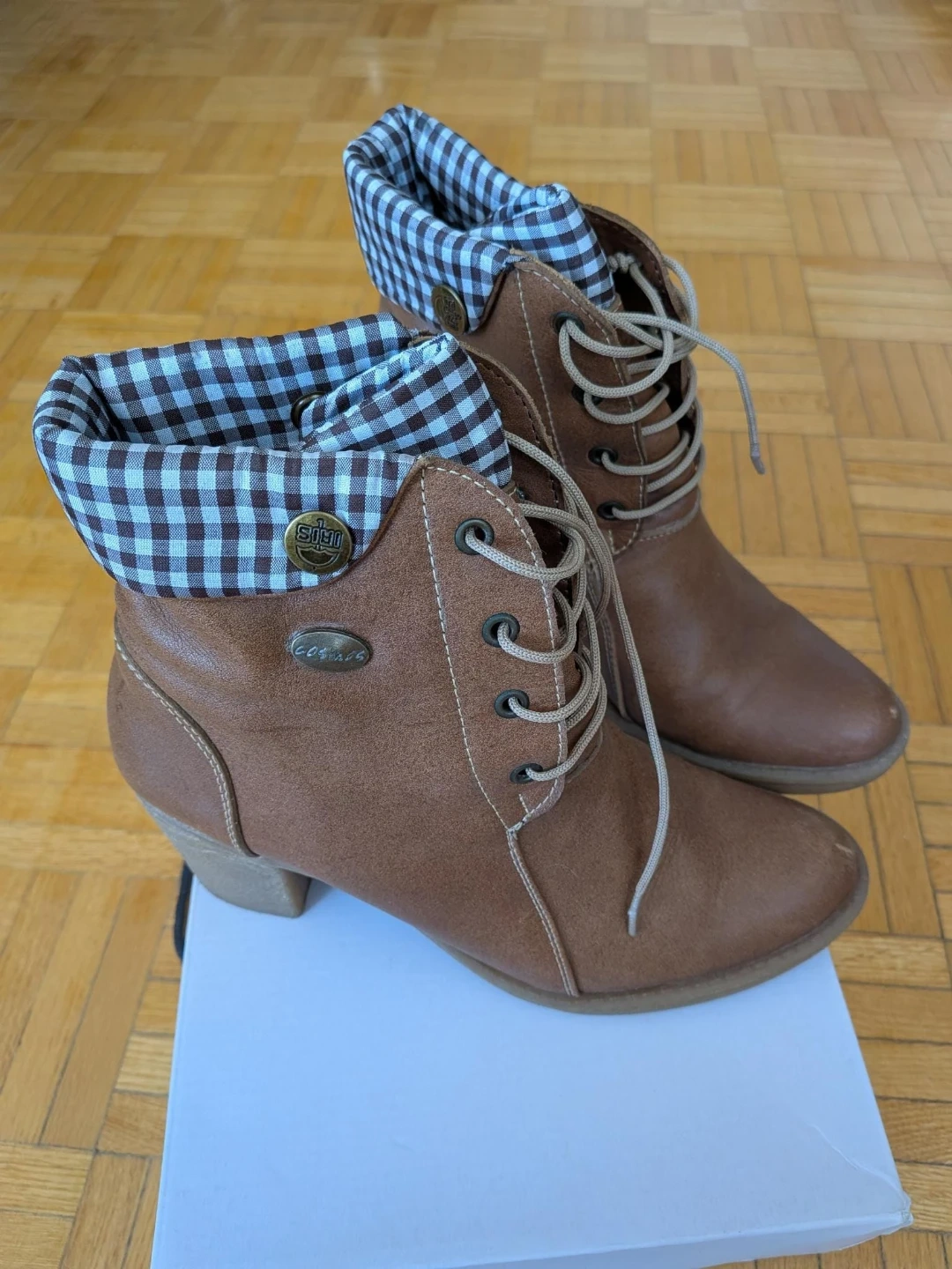 Stylish brown ankle boots featuring a cute gingham print lining and lace-up front. These boots have a comfortable heel height and a classic design. They're made from faux leather and are perfect for casual wear.