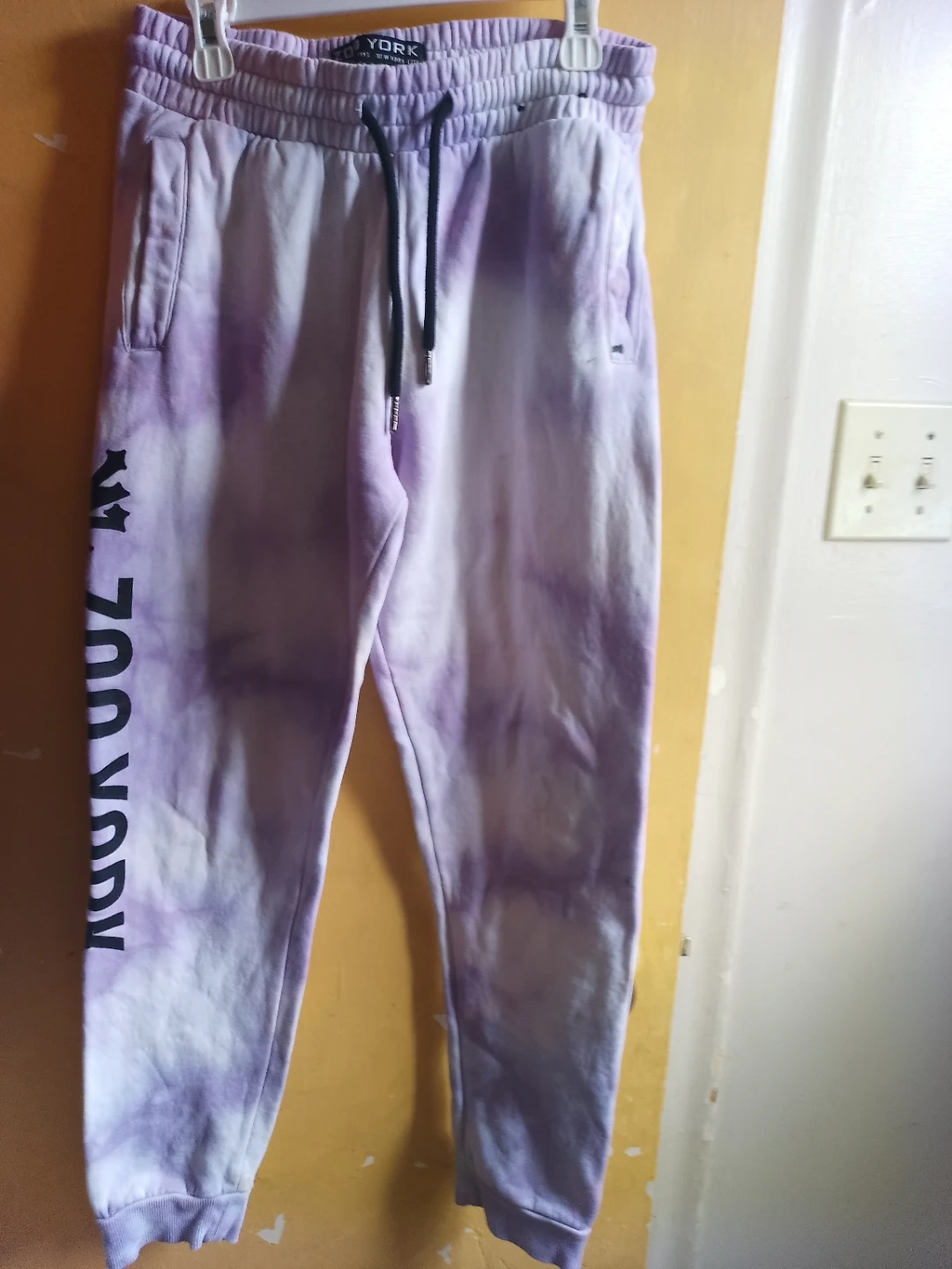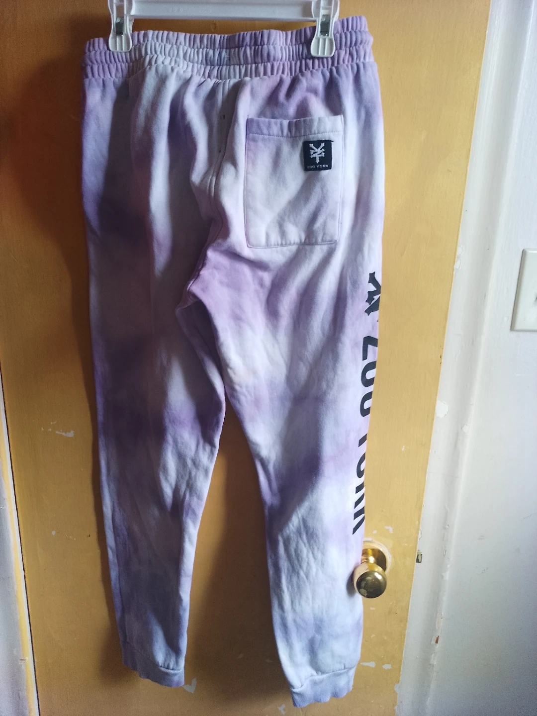 These Zoo York joggers have a cool tie-dye pattern in purple and white. They're size L/G (14) with an elastic waistband and drawstring. Great for casual wear!