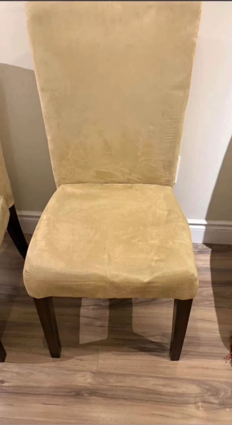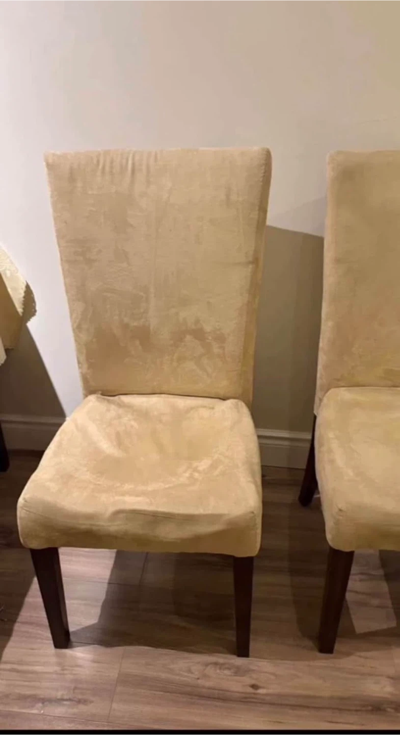 Selling a set of four beige dining chairs. These chairs feature upholstered seats and backs. Their neutral colour makes them a versatile addition to any dining room. Perfect for family dinners or entertaining guests!