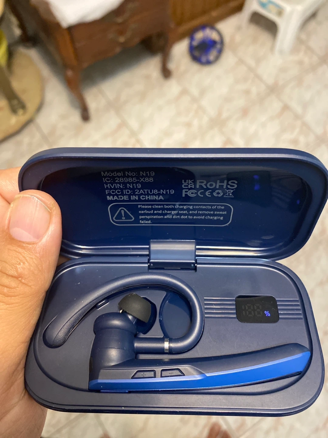 This is an N19 wireless earbud with its charging case. It's made in China. The charging case has a digital display showing battery percentage.