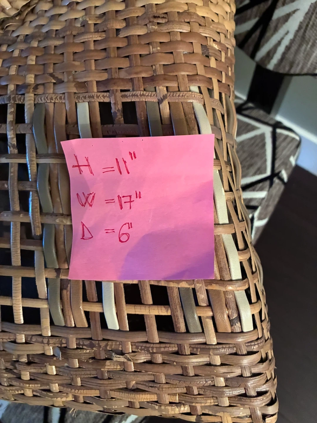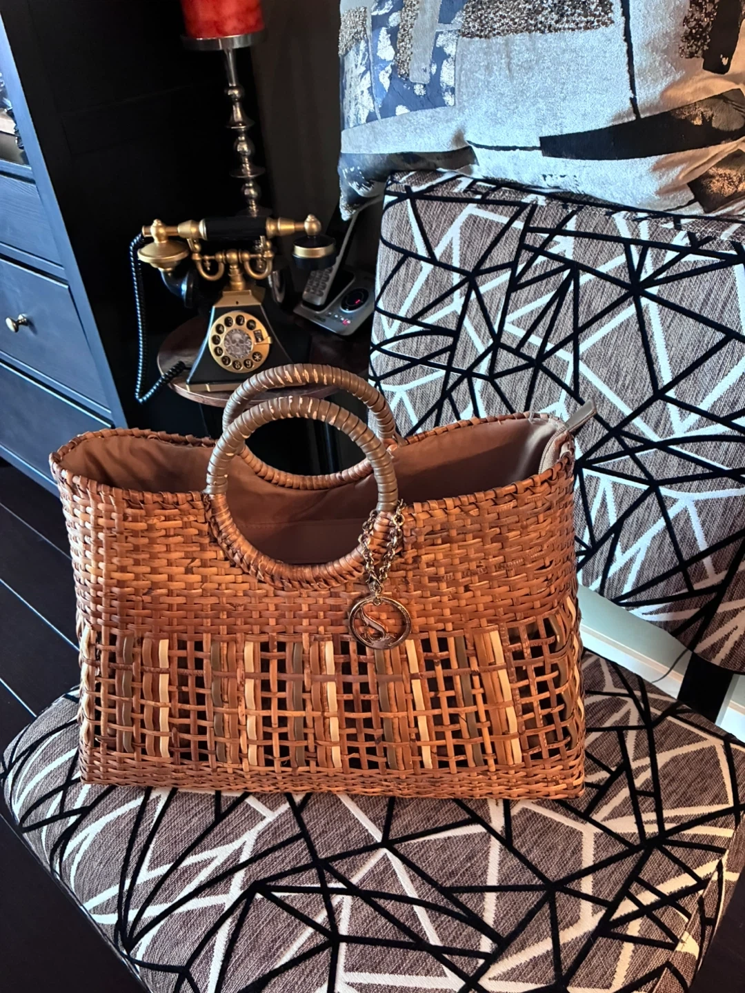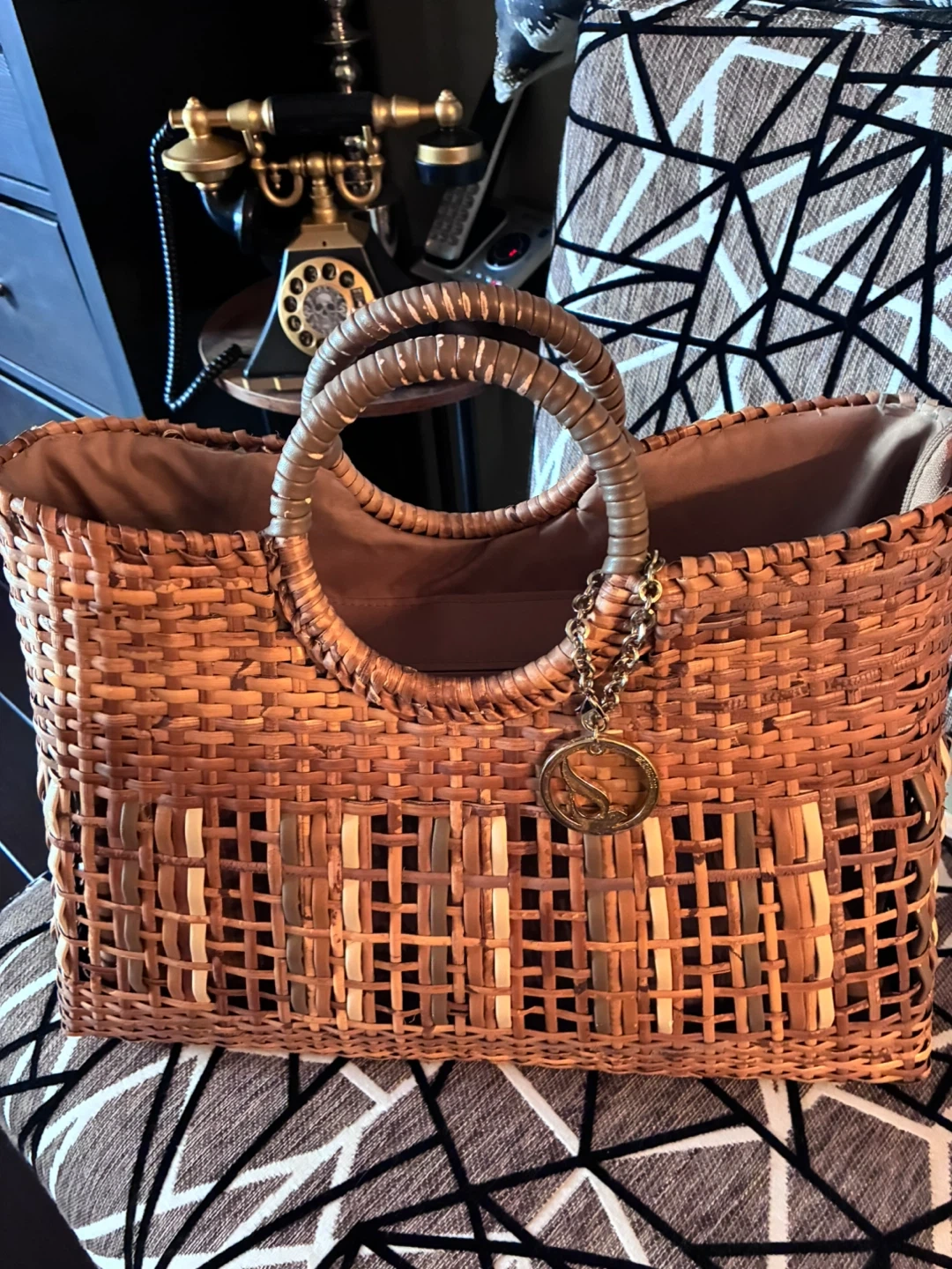 A stylish Abbacino tote bag with a woven straw exterior and fabric lining. It's approximately 11" high, 17" wide, and 6" deep. This bag is great for everyday use or a trip to the market!