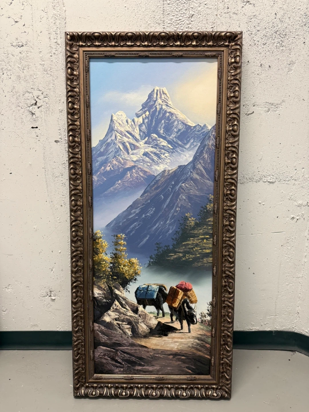 Vintage framed oil painting depicting a snowy mountain scene with yaks and people on a trail. The artwork showcases a rugged landscape with detailed brushwork. Ready to hang for your home decor!