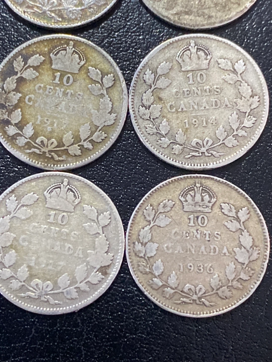 Collection of six Canadian 10 cent coins. Dates include 1910, 1911, 1914, 1917, 1936 and one coin with an unreadable year. All coins depict King George V or King George VI. Great for collectors!