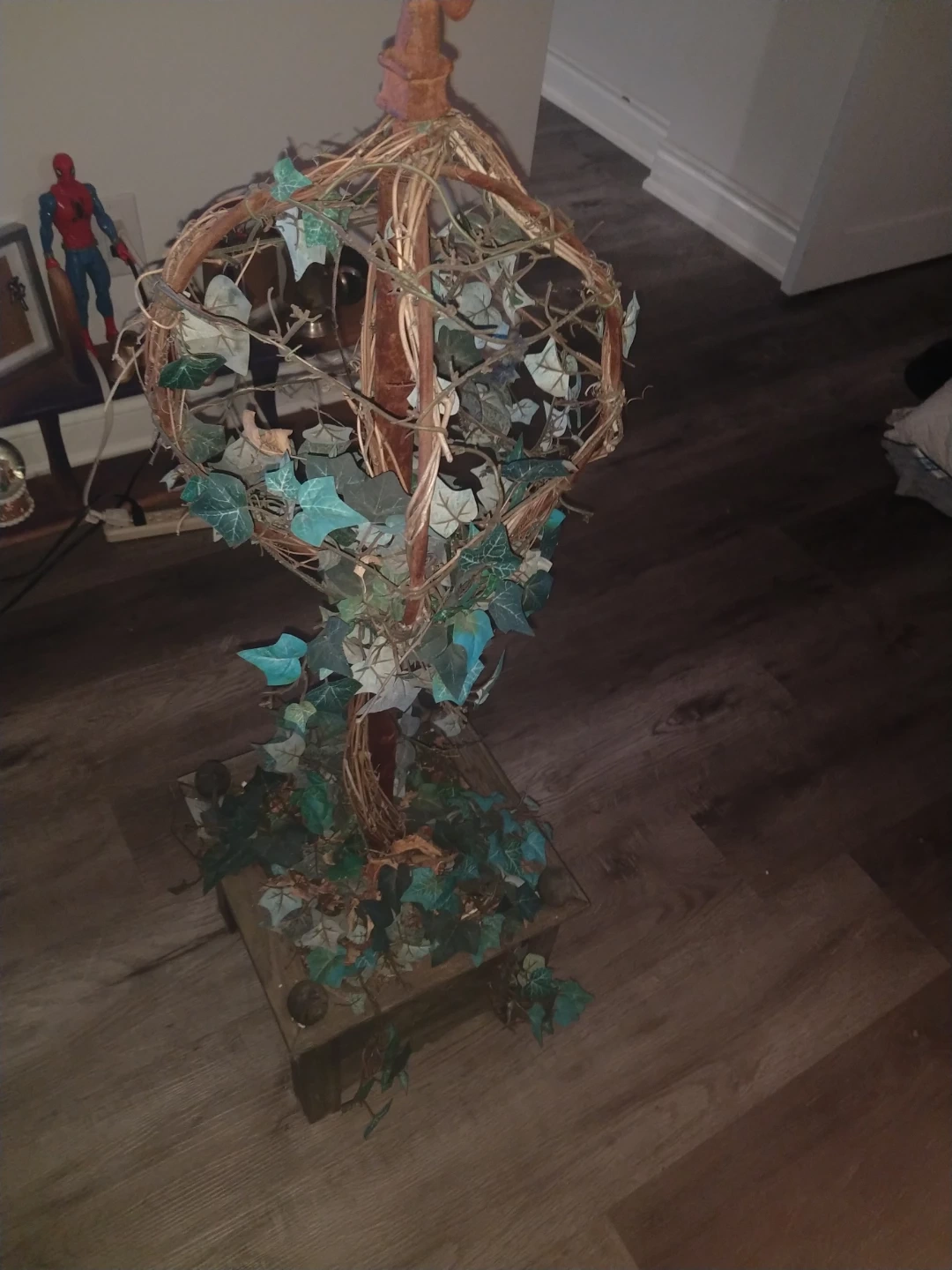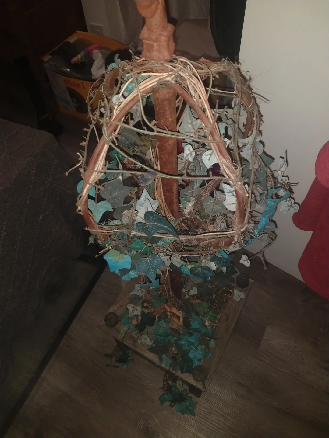 This unique decorative bird cage features a rustic wooden base and a whimsical, vine-covered design. It's adorned with artificial ivy in shades of green and blue. The cage structure is made of intertwined twigs and branches, creating an open, airy feel.
