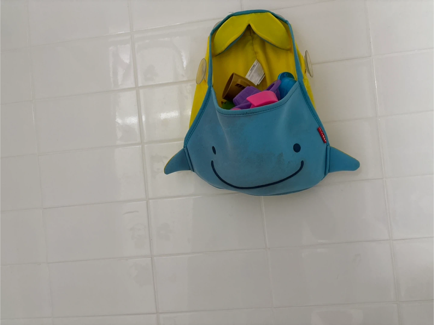 This Skip Hop bath toy organizer is designed like a friendly whale! It's perfect for keeping bath toys tidy. It attaches to the tub wall with suction cups. Mesh panels allow for quick drying.