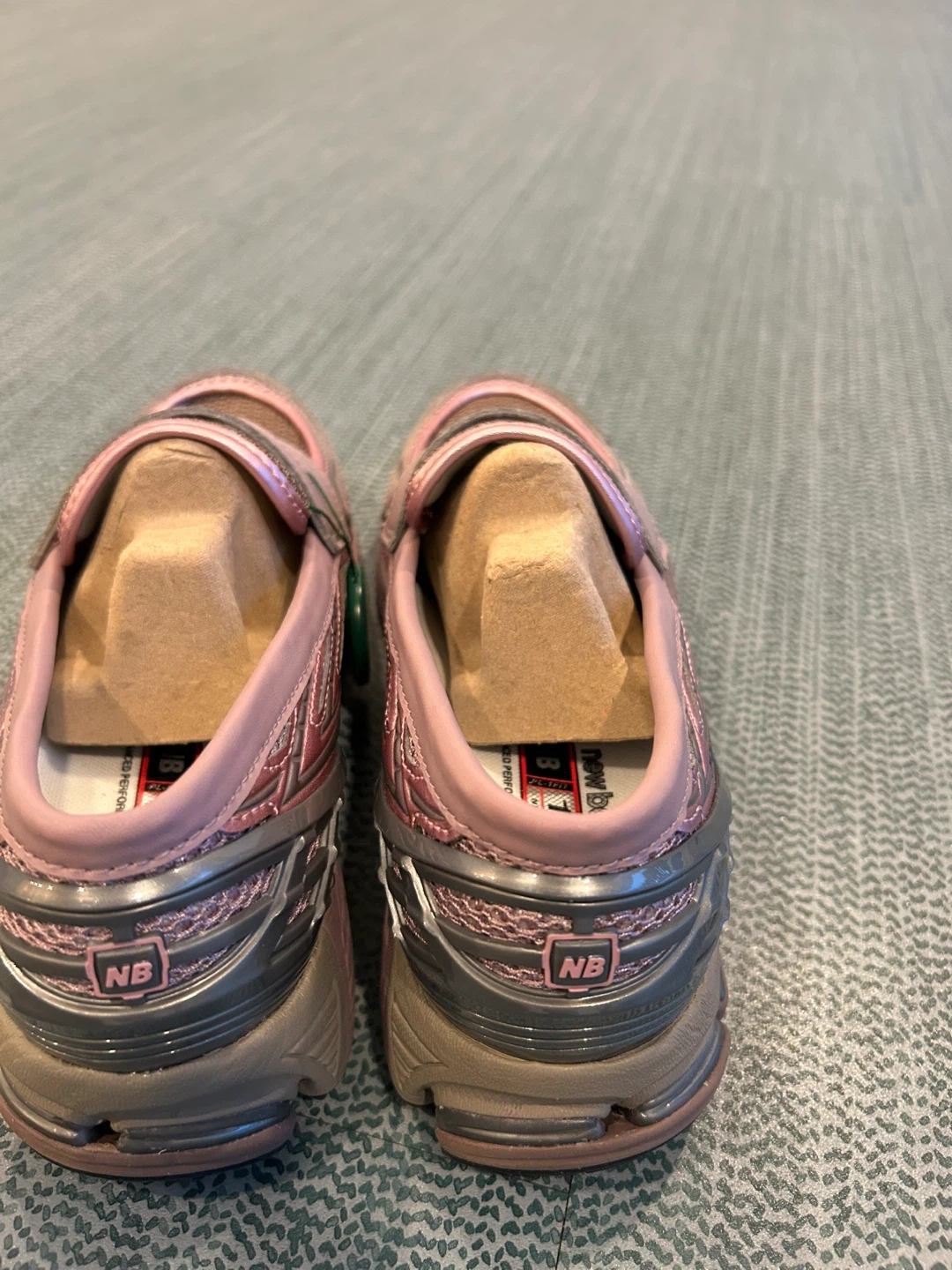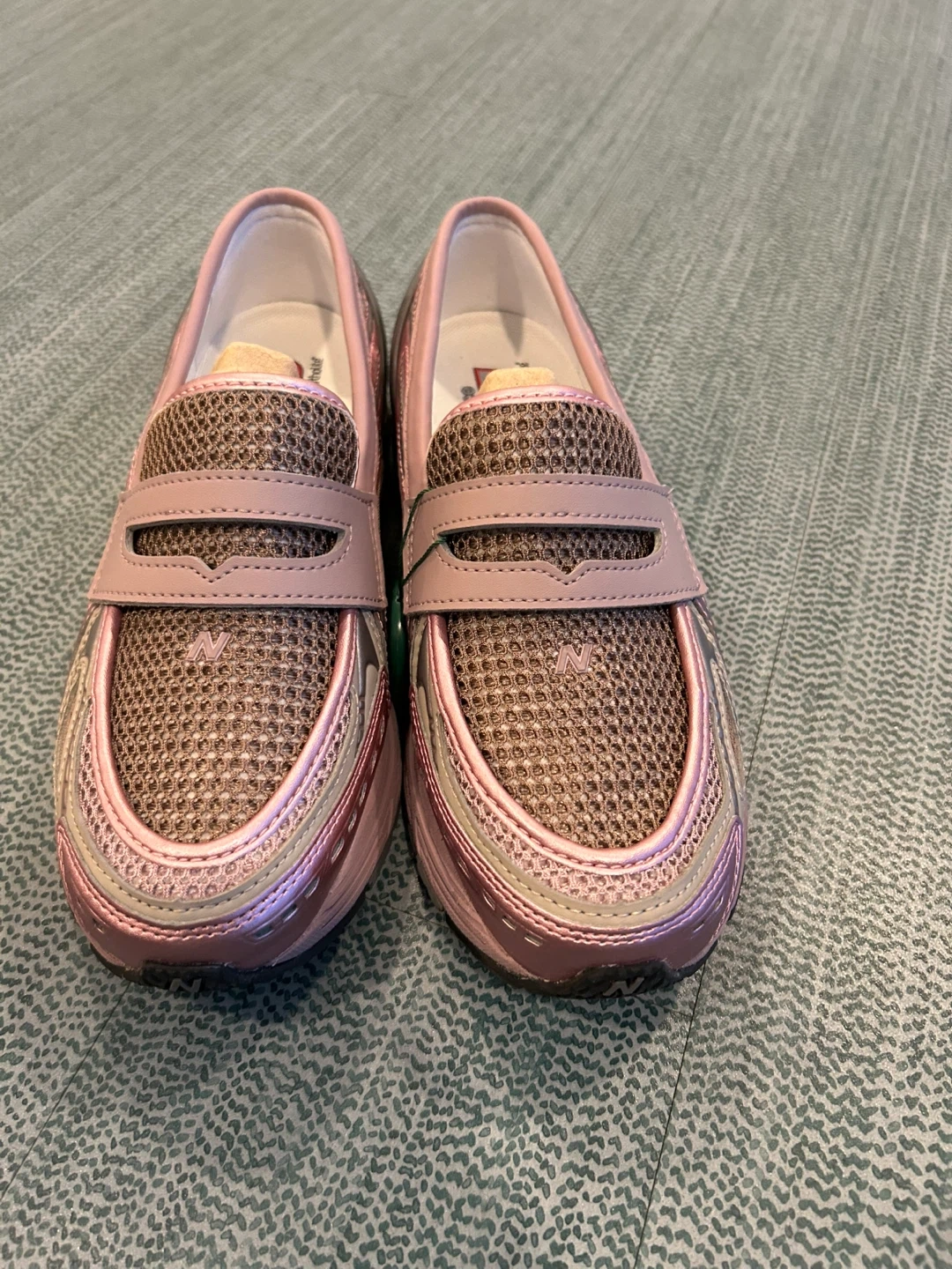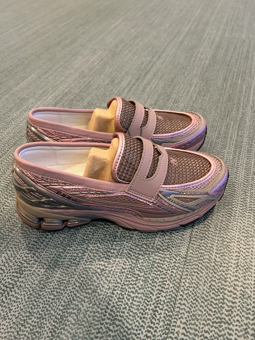 These New Balance loafers offer a unique blend of style and comfort. They feature a metallic pink and silver color scheme with mesh detailing. The slip-on design makes them easy to wear.