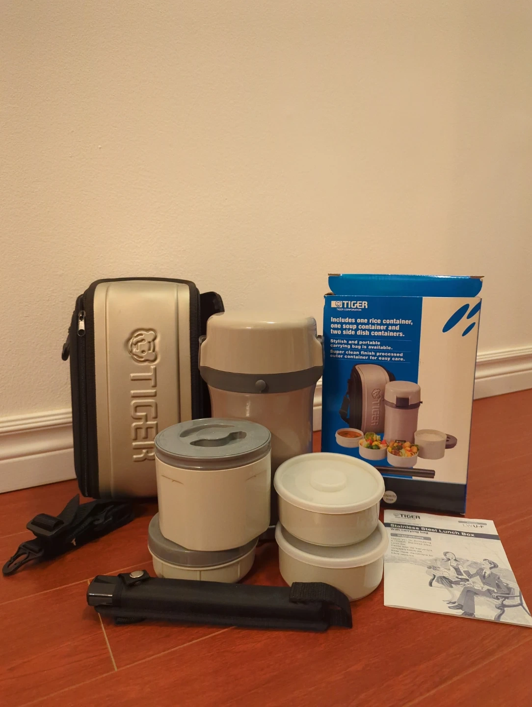A brand new Tiger lunch box includes one rice container, one soup container, and two side dish containers. It's stylish and portable with a carrying bag. The outer container has a super clean finish for easy care.