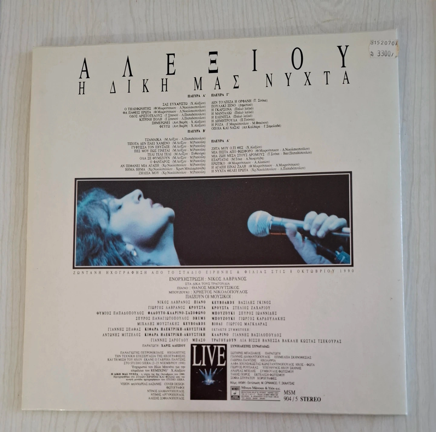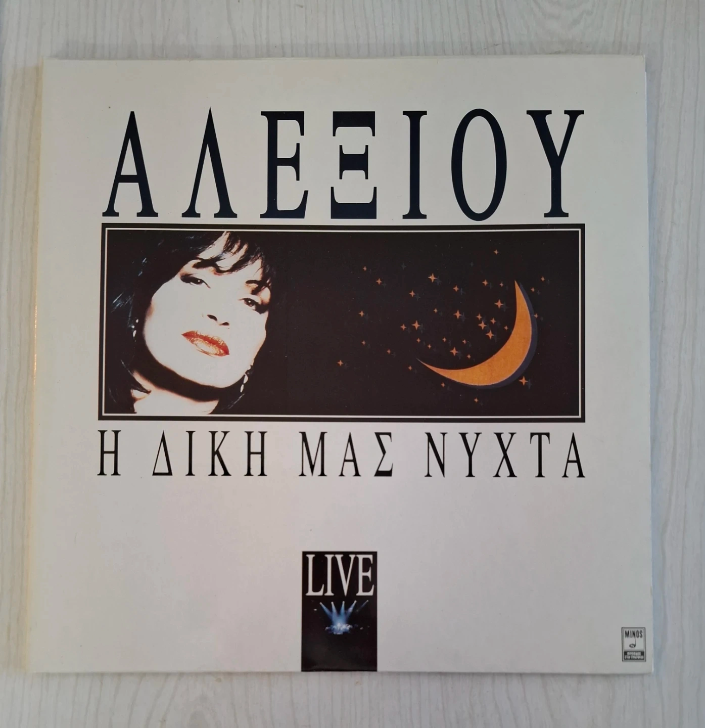 This is a live vinyl record by Alexiou titled 'H Diki Mas Nyxta'. It features a live recording from the 6th of October 1990. The record includes a gatefold sleeve with lyrics.