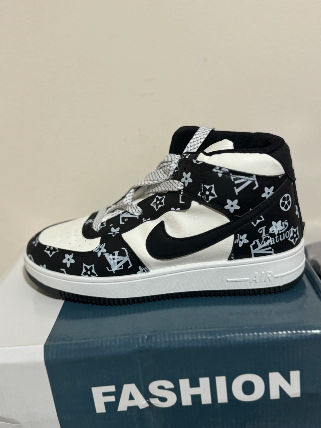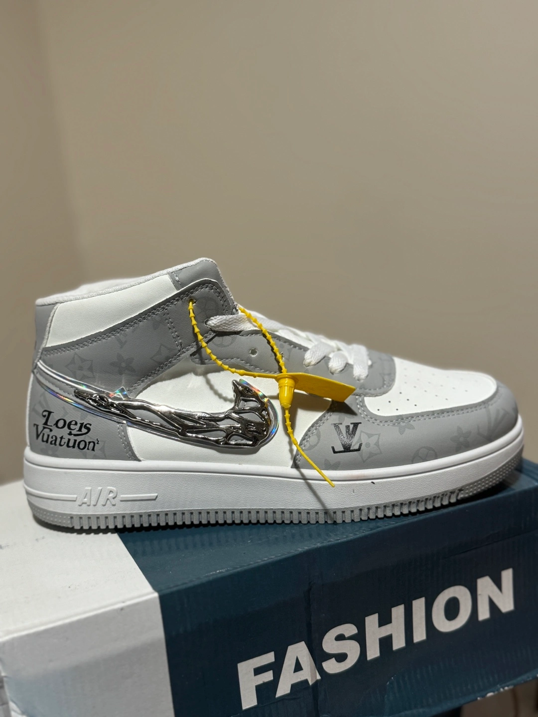 A pair of Air Jordan 4 style sneakers and a pair of Nike Air Force 1 Mid inspired sneakers are available. One pair features a white and black design with speckles. The other pair is a mid-top with a grey and white colourway, showcasing a repeating monogram pattern. Both pairs have a classic sneaker silhouette.