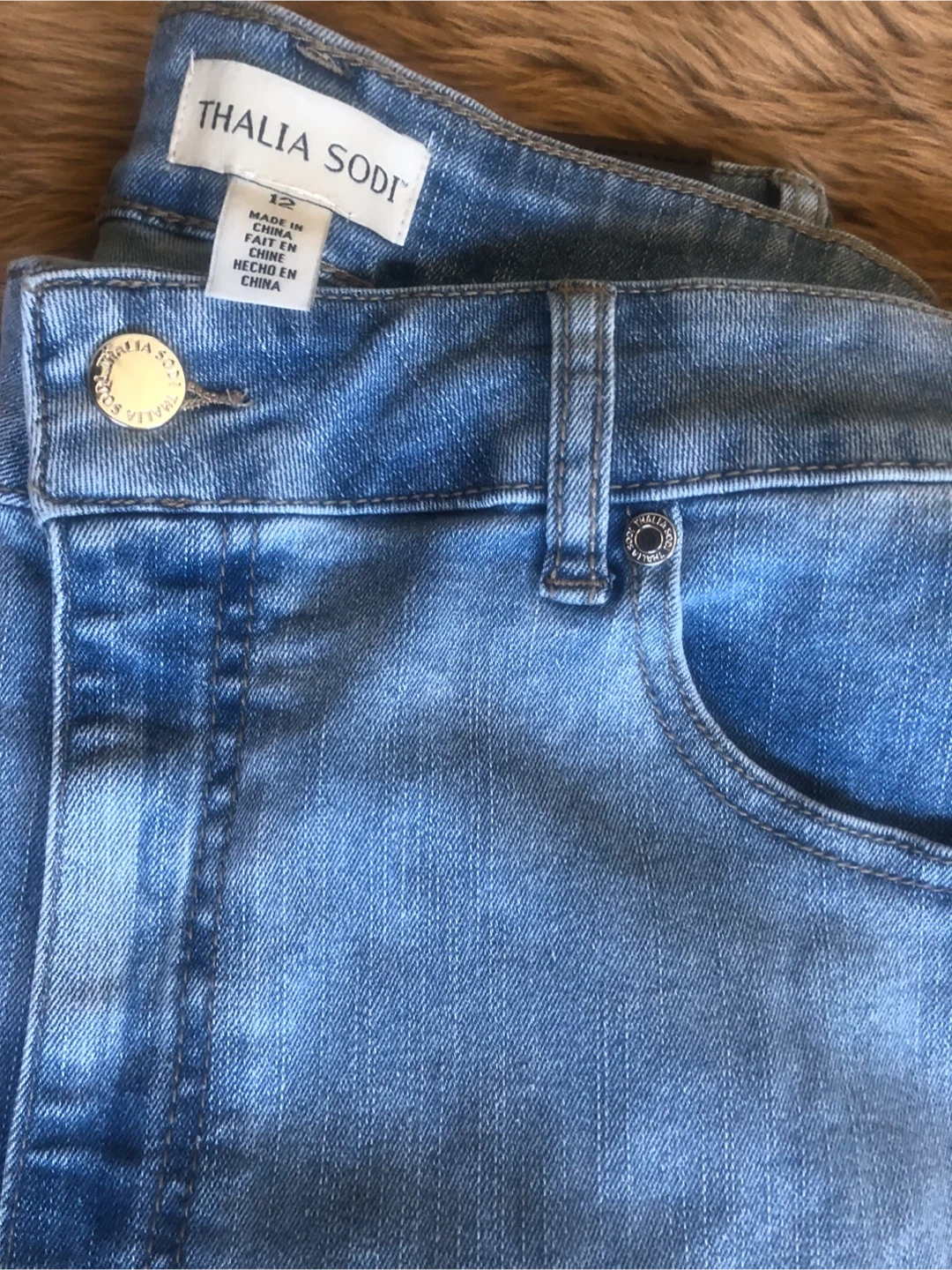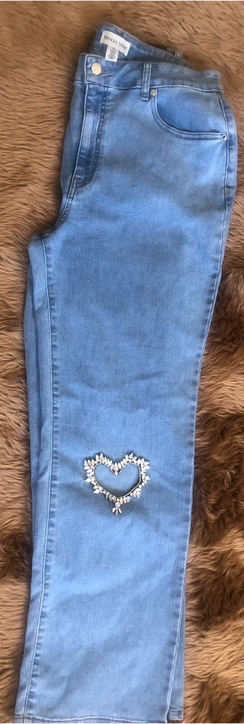 33 waist streachy material denim jeans feature a unique rhinestone-embellished heart design on the leg. They are a size 12 and made from a comfortable denim fabric. Perfect for adding a touch of sparkle to your casual outfits!