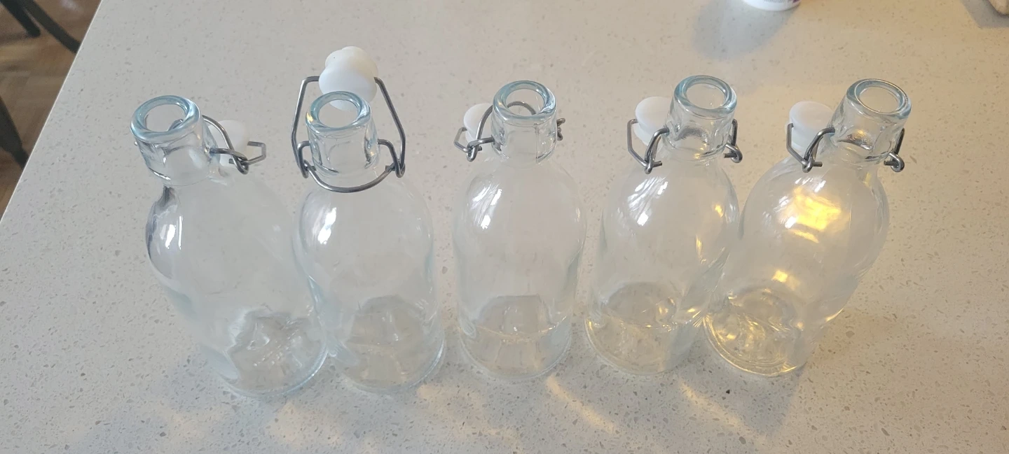 Selling a set of 5 clear glass bottles, each with a swing top stopper. They're perfect for storing homemade beverages, oils, or dressings! The bottles are in great condition and 500 mL capacity.