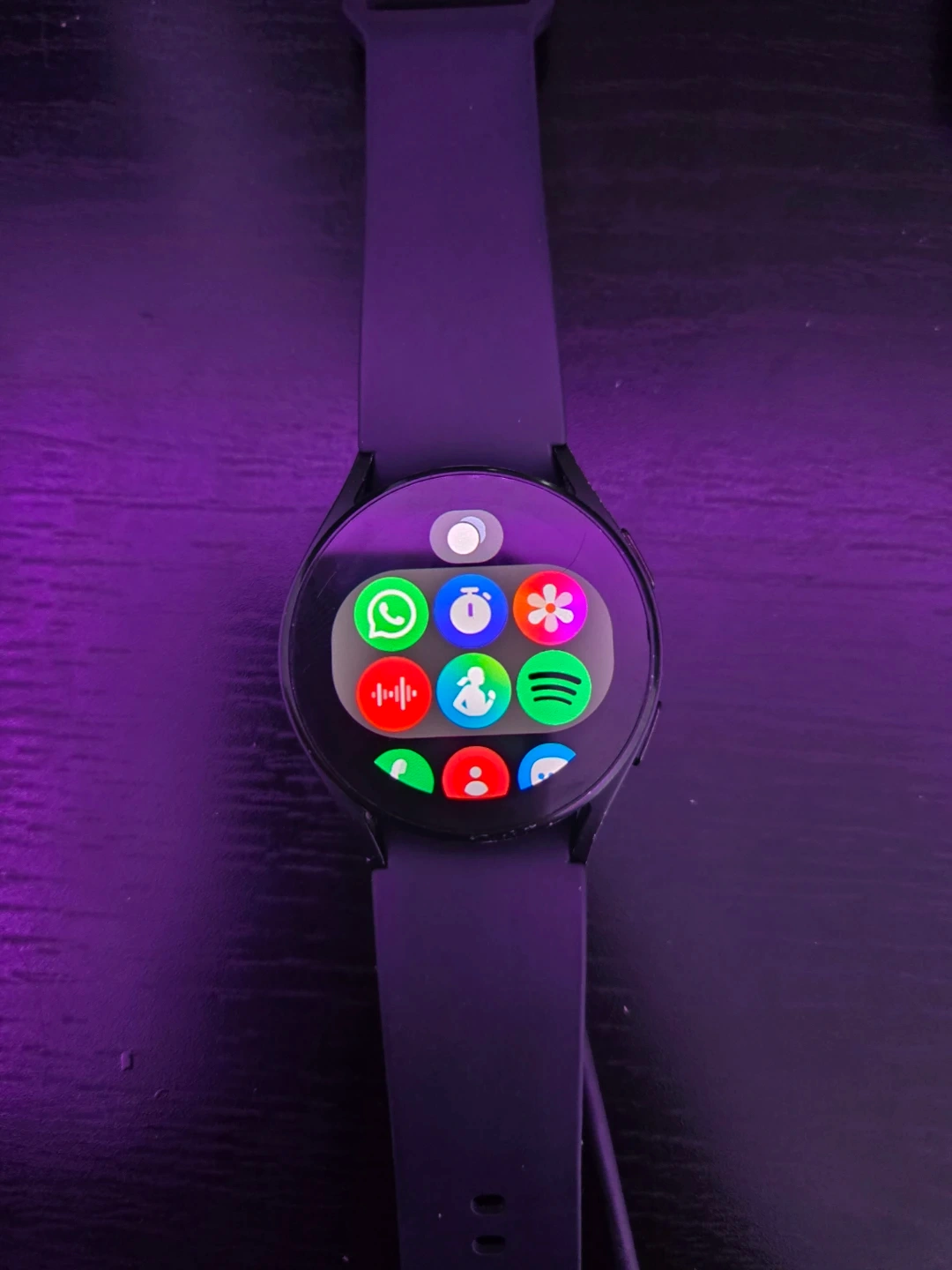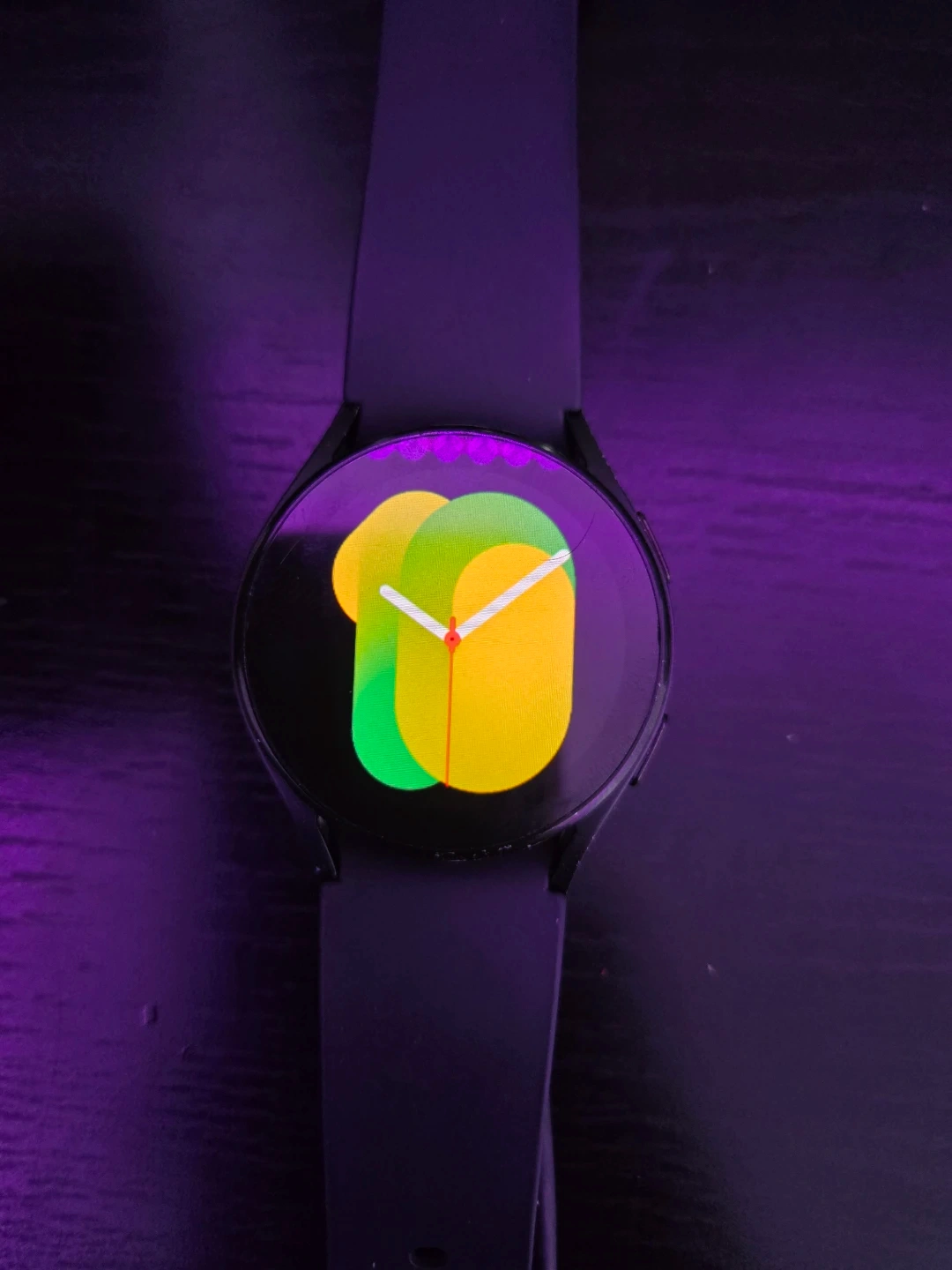 Samsung Galaxy Watch 5 with a black strap. It's a smart wearable device. Charging puck included. Always on display